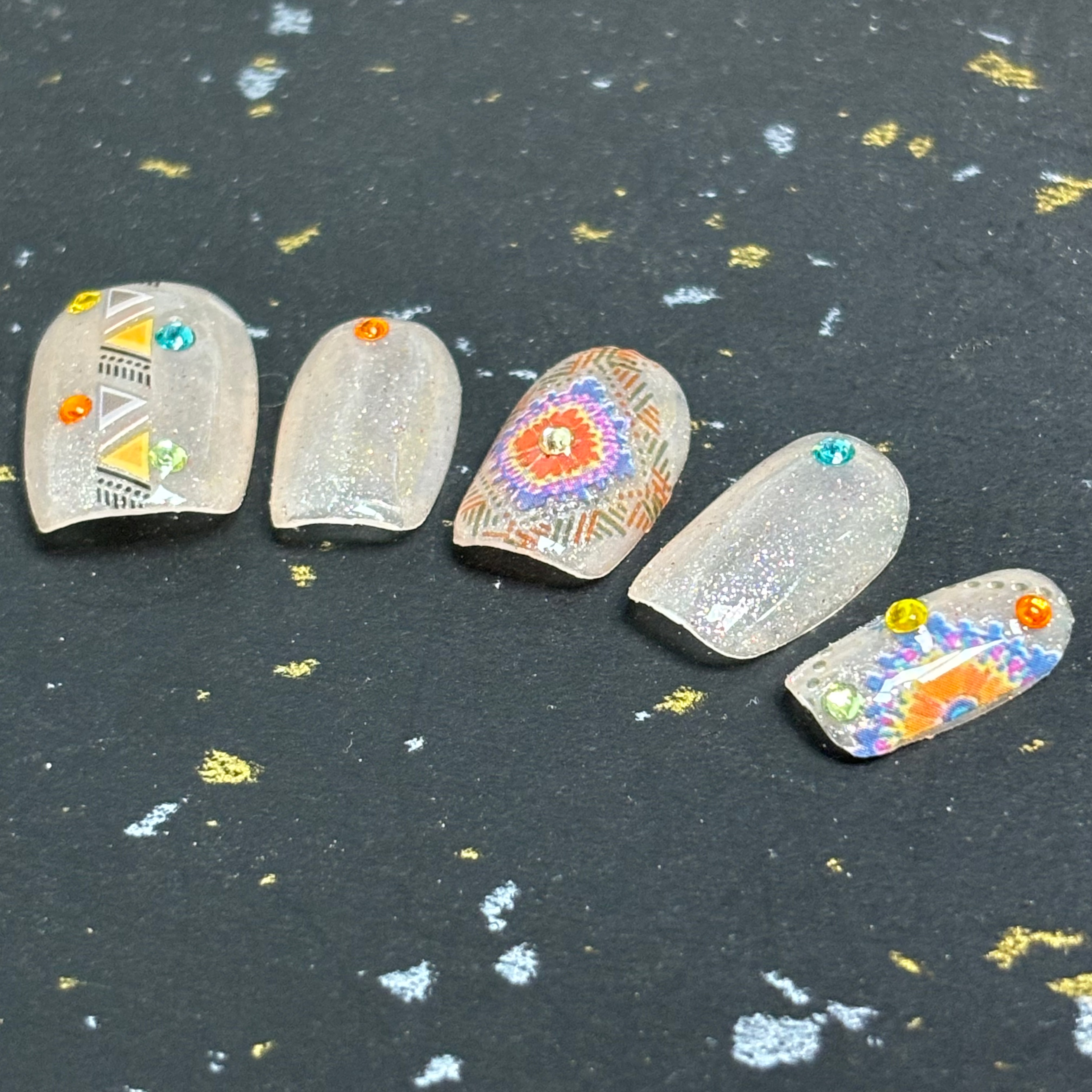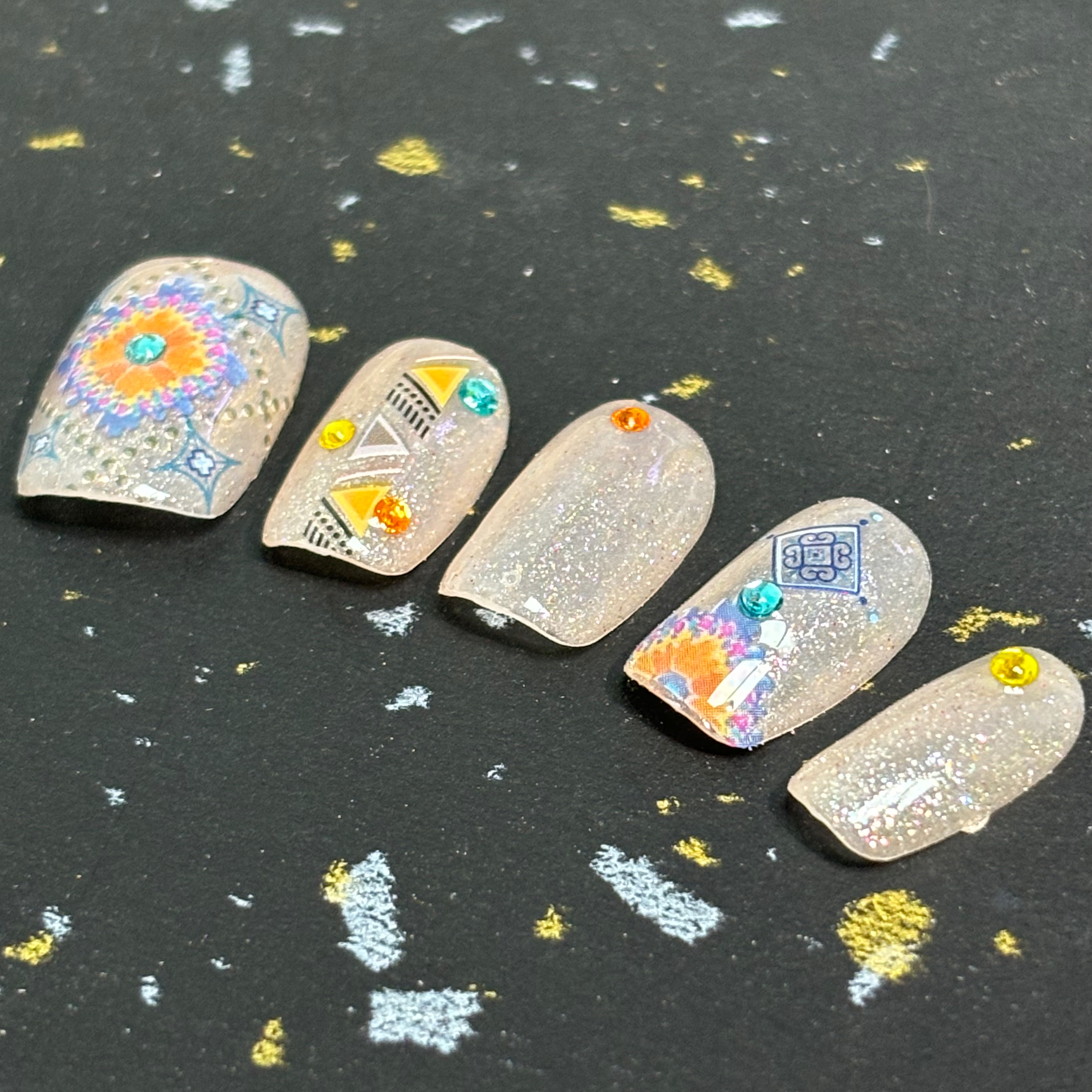 幾何圖形與彩鑽的碰撞,復刻出摩洛哥市集的絢爛;彩色水鑽與閃片像沙漠星空的斑斕碎片,讓花紋更具層次感。 - 全人手設計穿戴甲💅 (拼貼款) ✨甲型:方 ✨尺寸: S - 歡迎來圖訂製💕 (🌸圖片會有少量色差🌸)