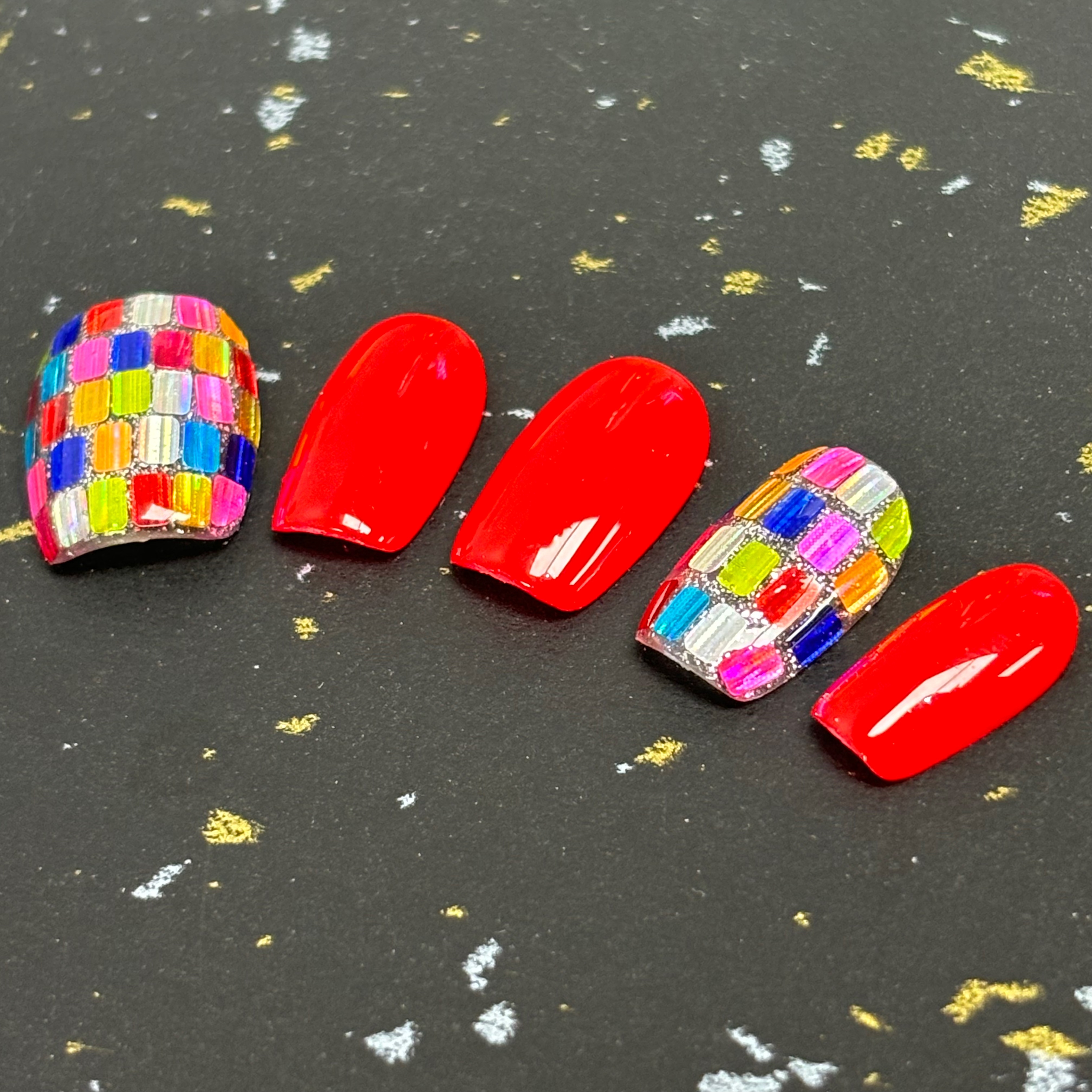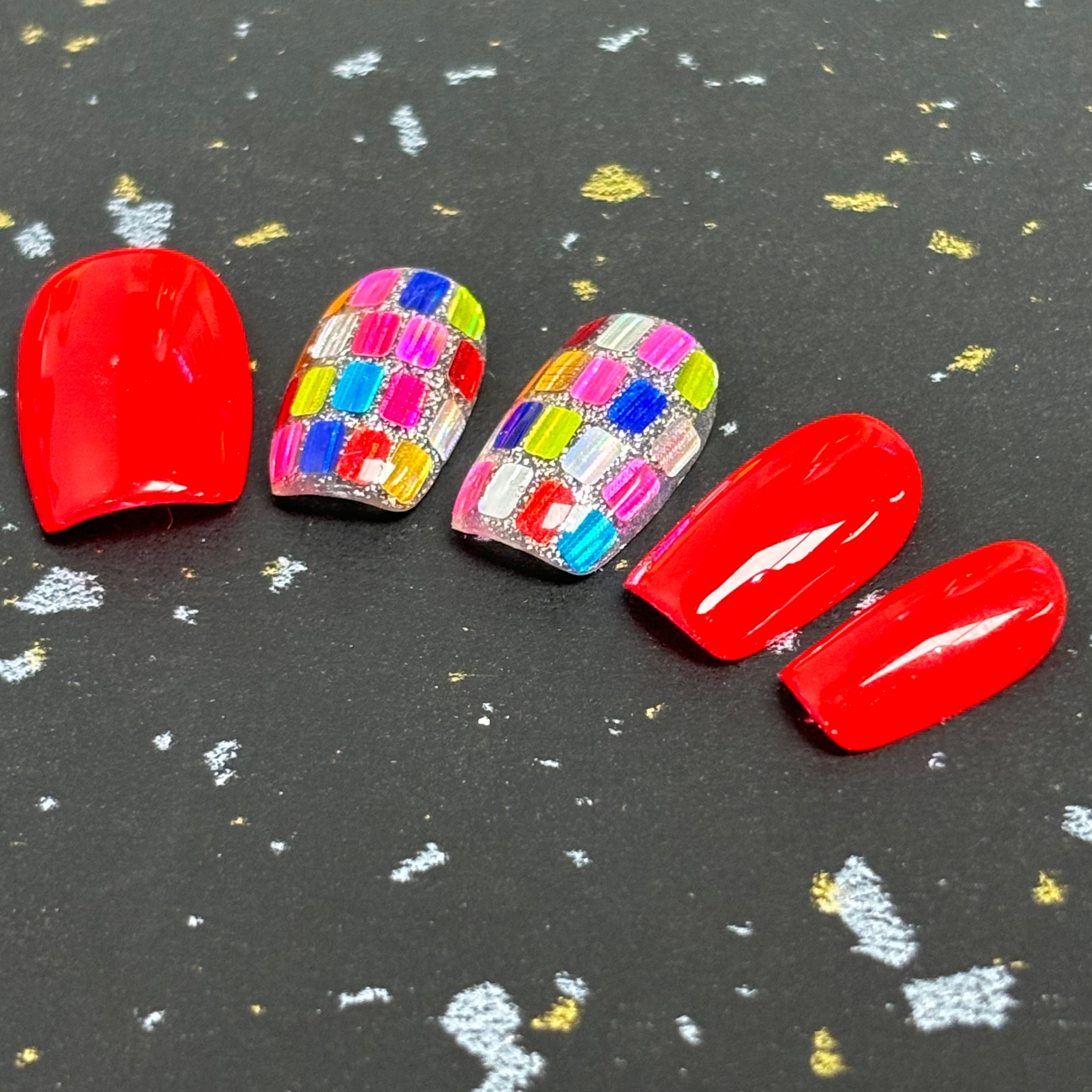 正紅底色如烈焰般奪目,彩色馬賽克紋樣如藝術裝置的大膽拼貼,每一塊色彩都迸發著鮮活張力。是吸睛滿分的藝術氣場,是追求個性、熱愛色彩碰撞人士的美甲潮流之選。 - 全人手設計穿戴甲💅 (拼貼款) ✨甲型:方 ✨尺寸: S - 歡迎來圖訂製💕 (🌸圖片會有少量色差🌸)