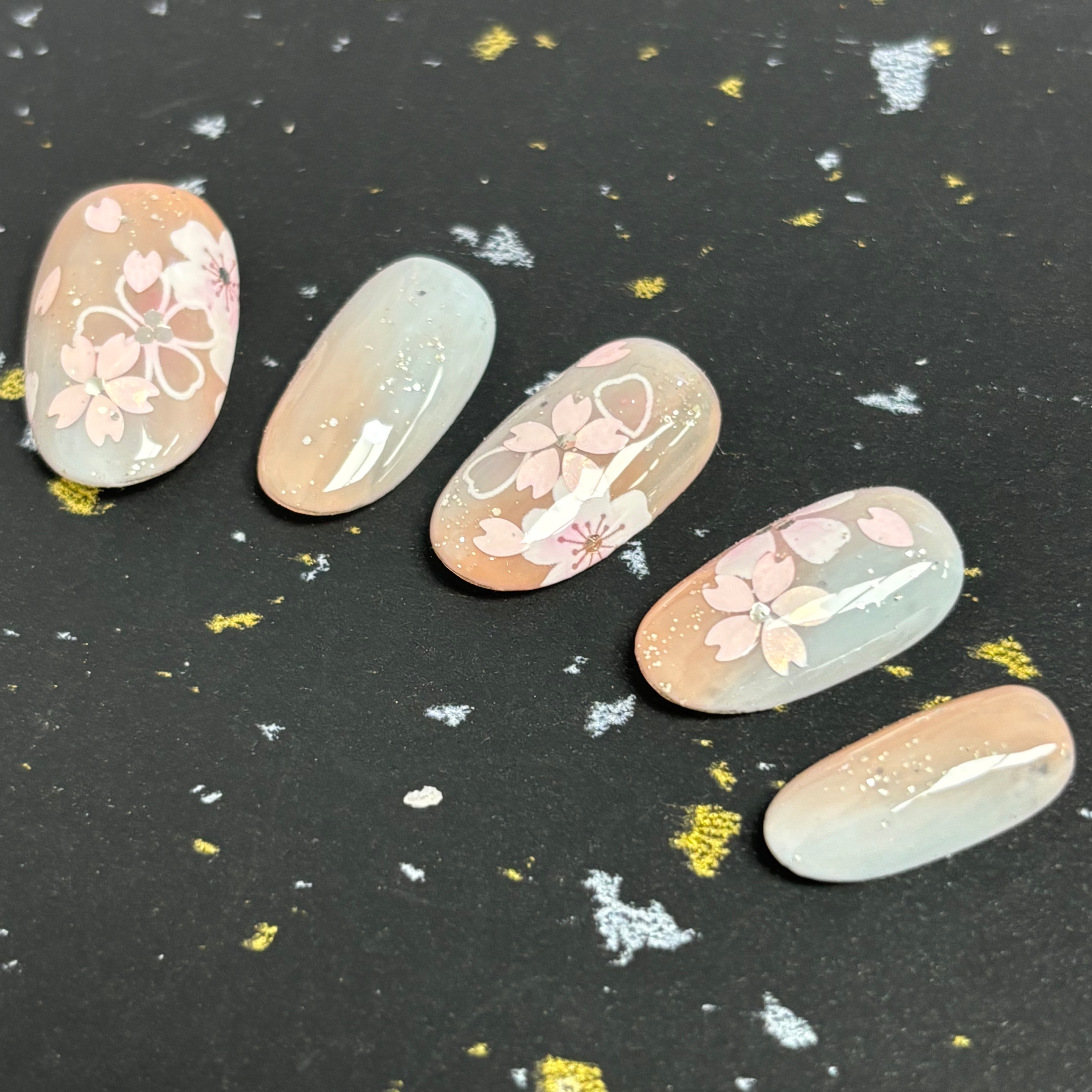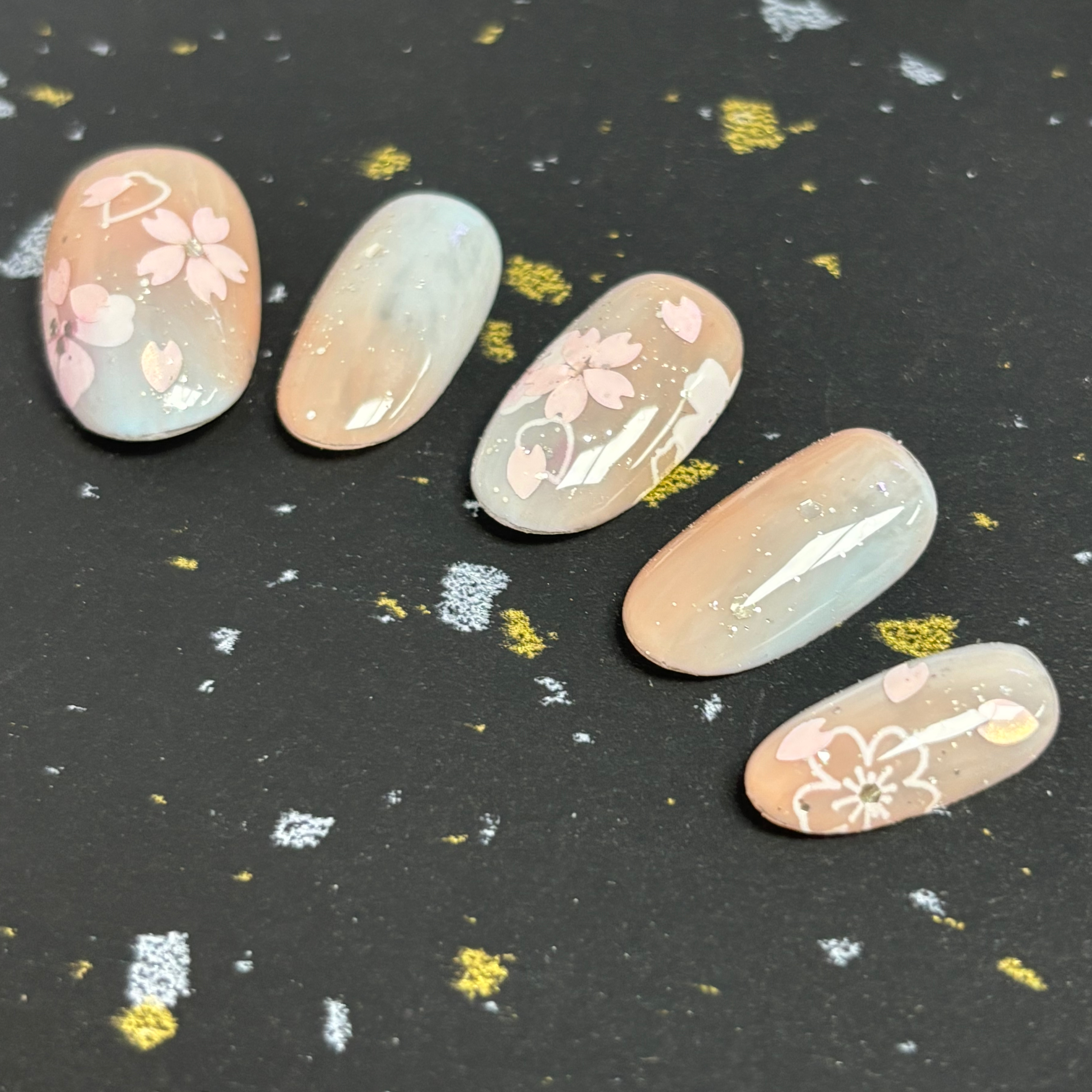 像是把春日晨霧揉進甲面,淡粉櫻朵落在清透漸變里,細碎閃片像霧裡藏的星光,指尖一抬,就是溫柔到骨子裡的氛圍感 - 全人手設計穿戴甲💅 (手繪款+拼貼款) ✨甲型:橢圓 ✨尺寸: S - 歡迎來圖訂製💕 (🌸圖片會有少量色差🌸)
