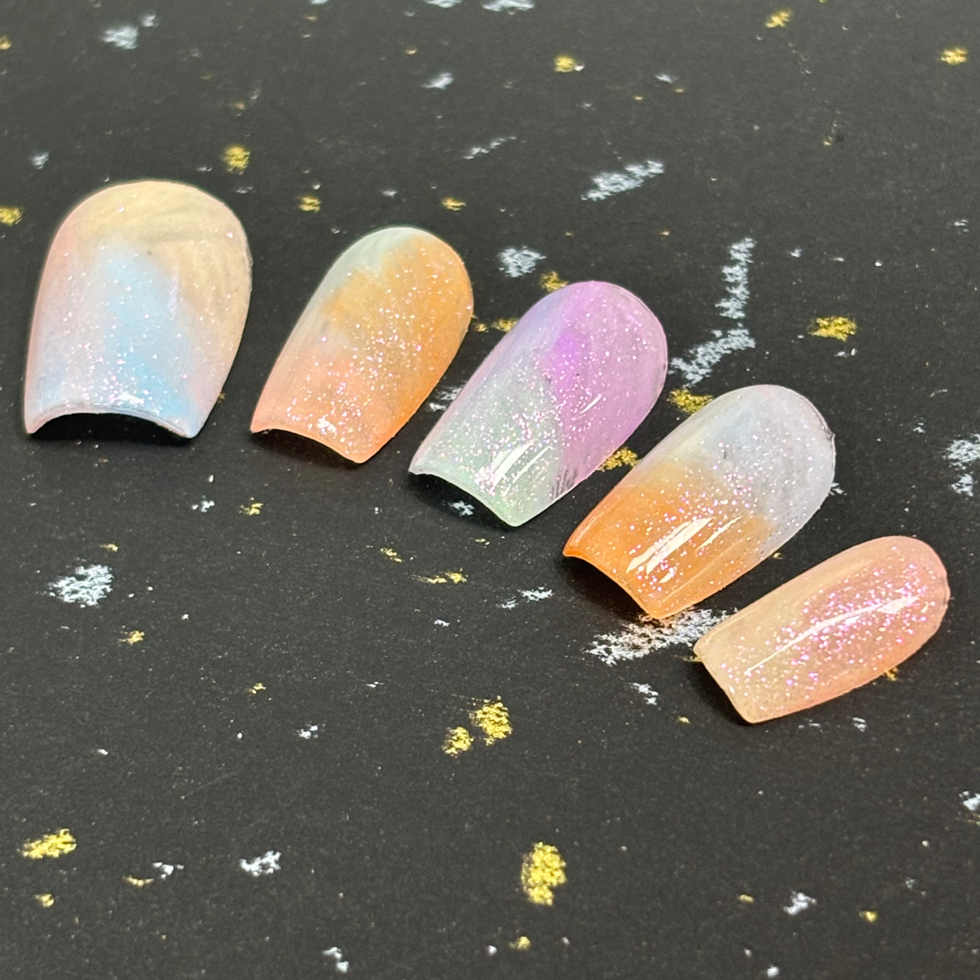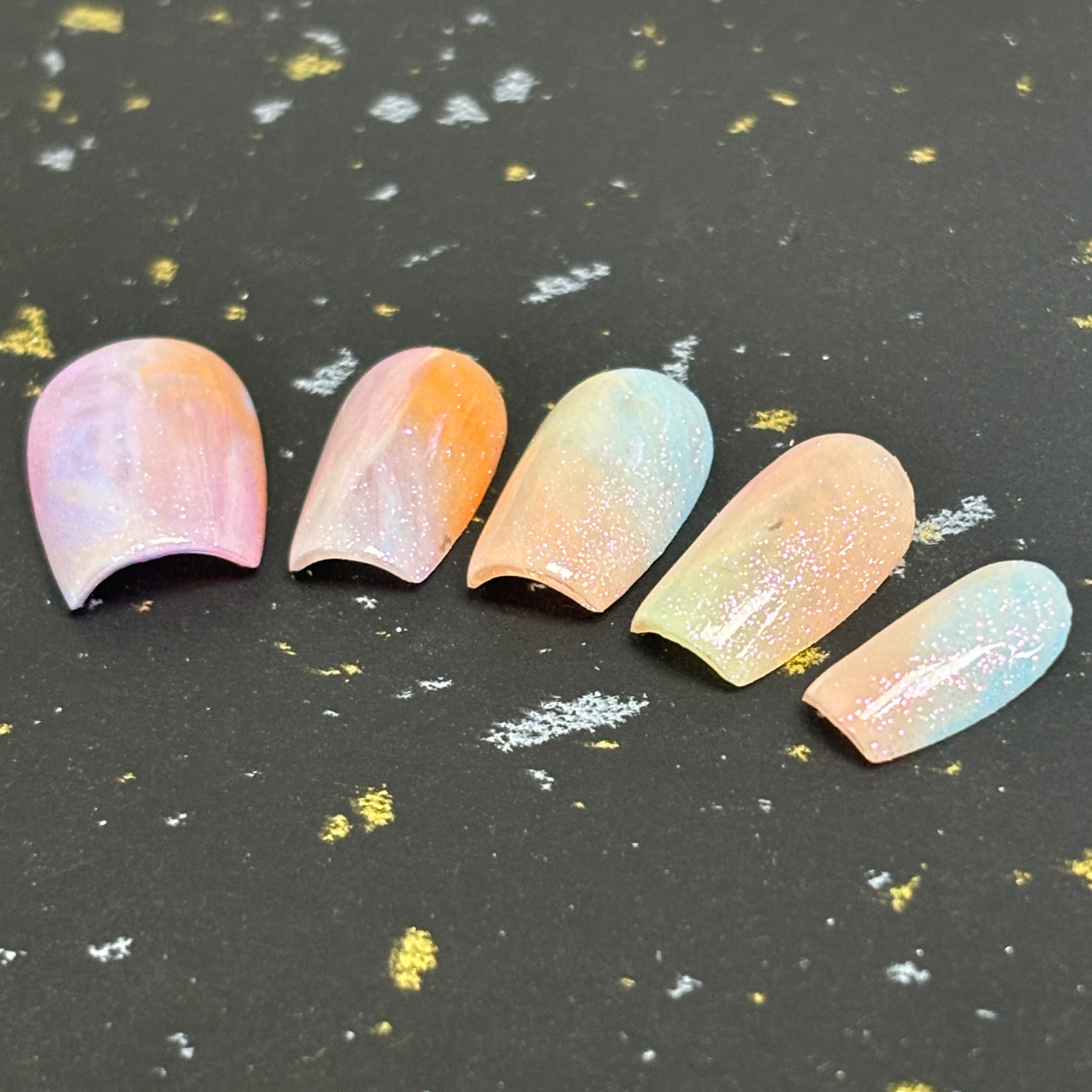 粉、橙、藍、紫的漸變如打翻的馬卡龍調色盤,細碎閃鑽似揉碎的星光,漾開夢幻的暈染,把整個彩虹銀河的浪漫都攥在了指尖,是永不褪色的童話感。 - 全人手設計穿戴甲💅 (手繪款) ✨甲型:方 ✨尺寸: S - 歡迎來圖訂製💕 (🌸圖片會有少量色差🌸)