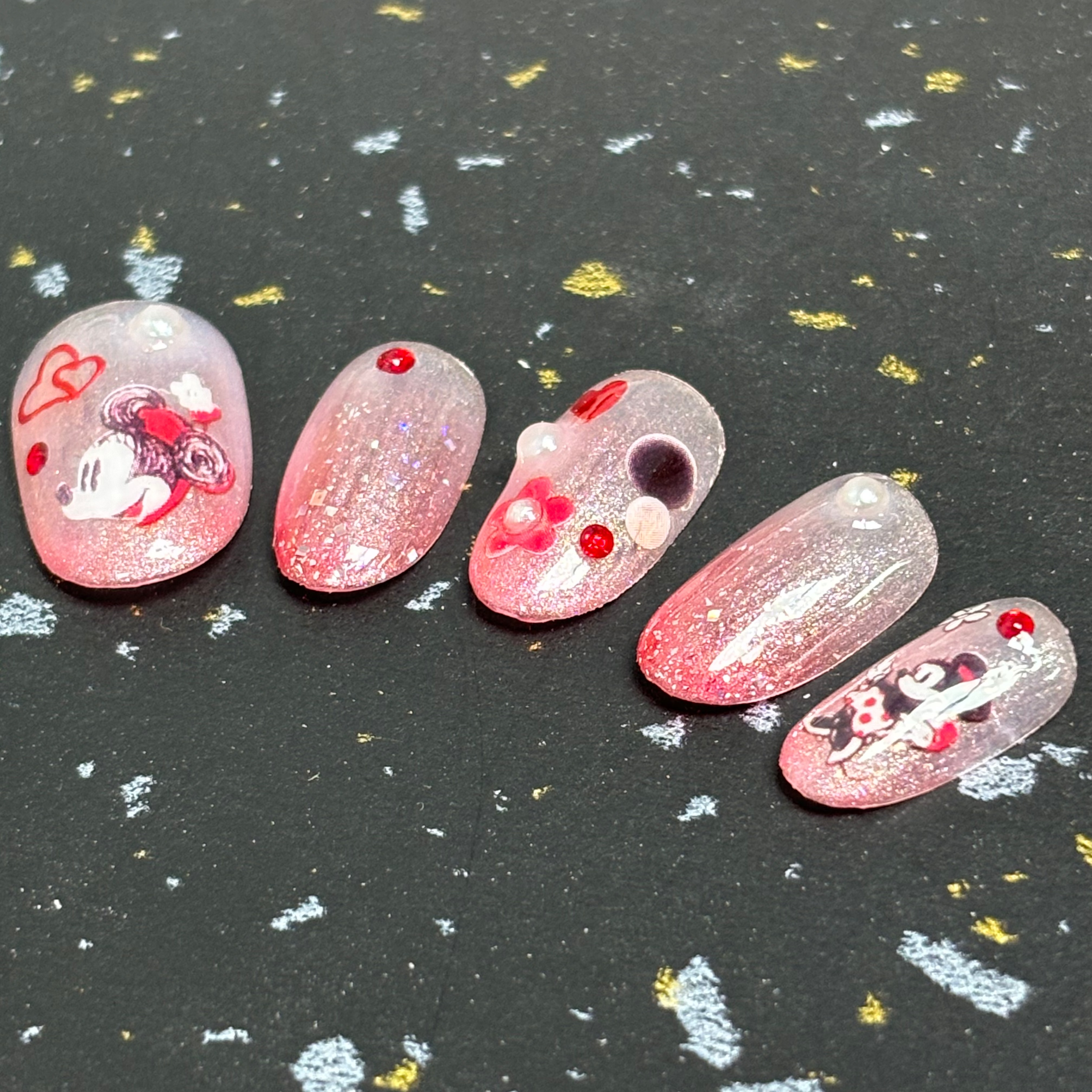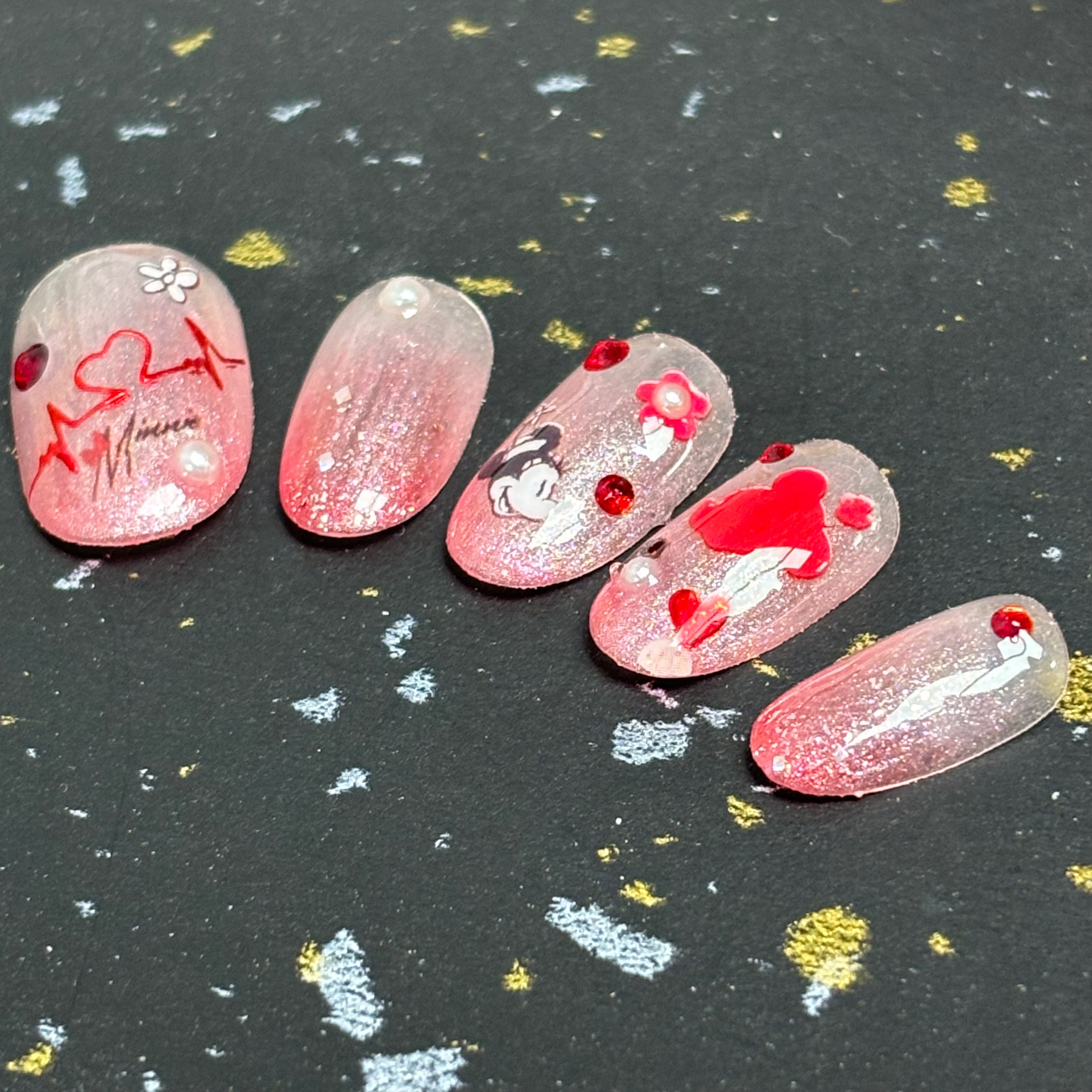 當米妮的俏皮遇上粉紅閃鑽的甜,把童話浪漫釘在了指尖。米妮卡通形象靈動又可愛,紅心跳動線條是少女的心動信號,珍珠與紅鑽的點綴像灑在指尖的糖果,滿鋪的粉紅細閃甲是公主裙的裙擺,在日常有一份童趣感,元氣又甜美的氣息,成為減齡美甲里的「童話擔當」。 - 全人手設計穿戴甲💅 (手繪款+拼貼款) ✨甲型:橢圓 ✨尺寸: M - 歡迎來圖訂製💕 (🌸圖片會有少量色差🌸)