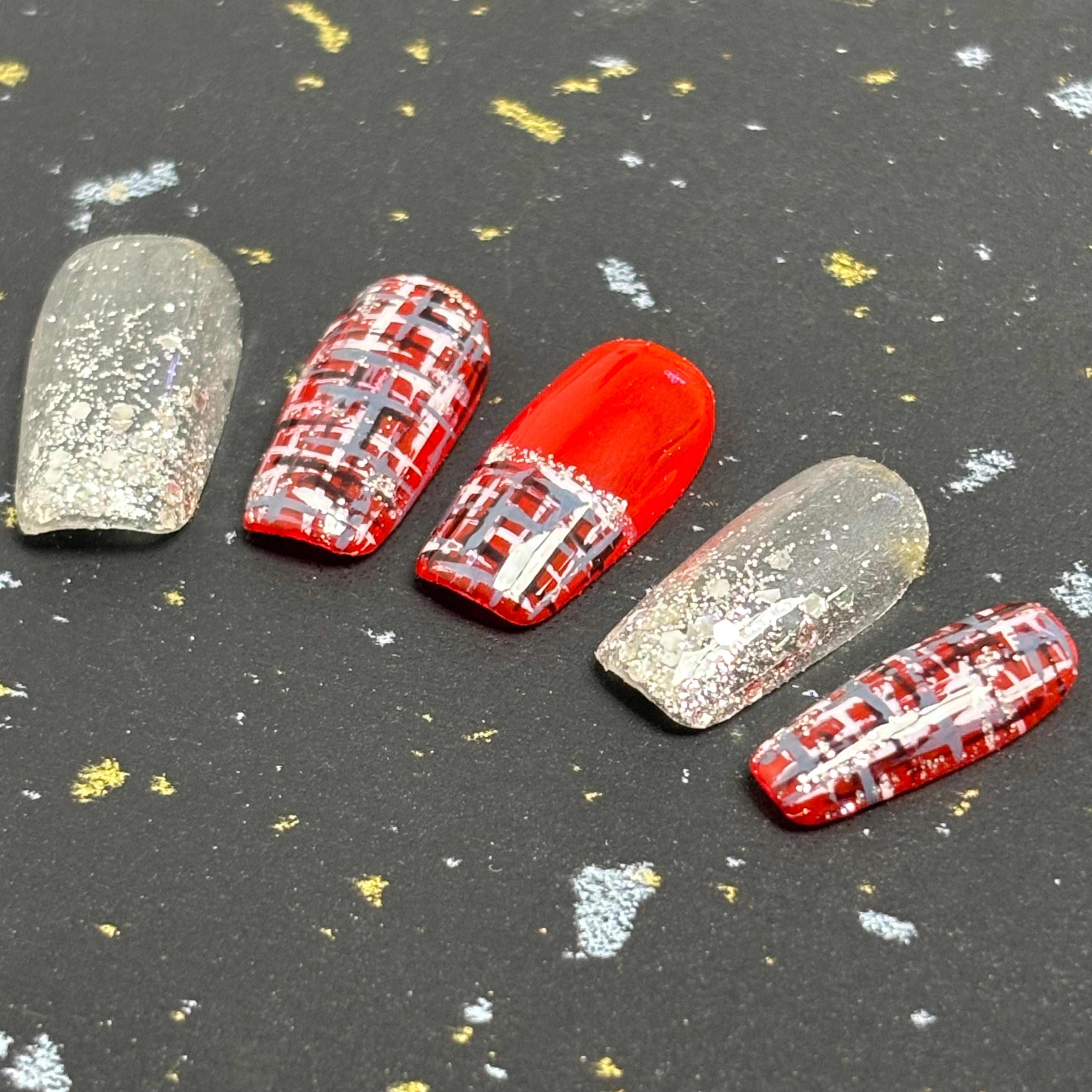 正紅如焰,銀閃似星,格紋交織出復古又摩登的韻律。銀箔碎閃像落了滿指星光,紅底格紋則帶著濃郁的節日氛圍,是新年的紅火期許,也是日常的輕奢點綴。 - 全人手設計穿戴甲💅 (手繪款+拼貼款) ✨甲型:中梯方 ✨尺寸: XS - 歡迎來圖訂製💕 (🌸圖片會有少量色差🌸)