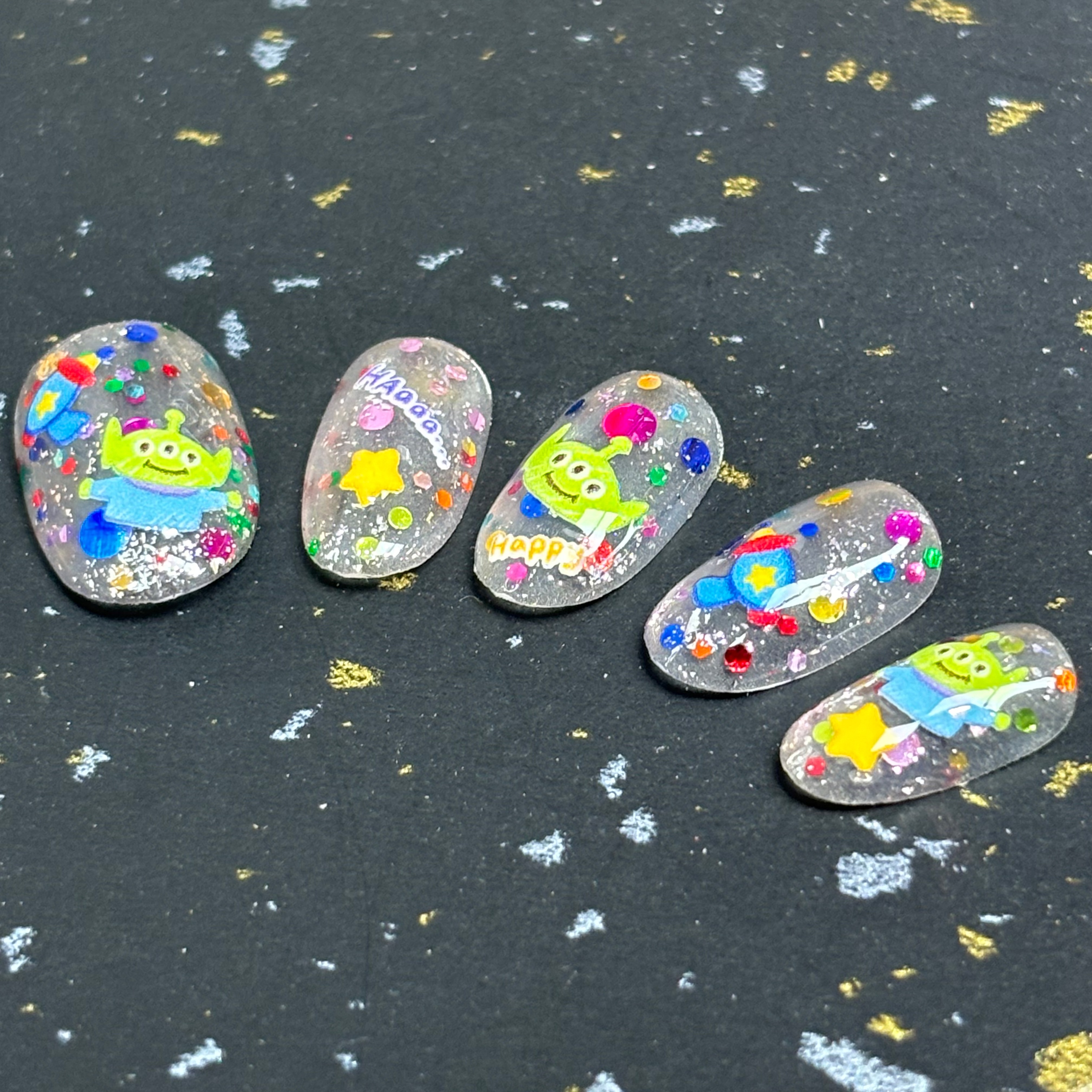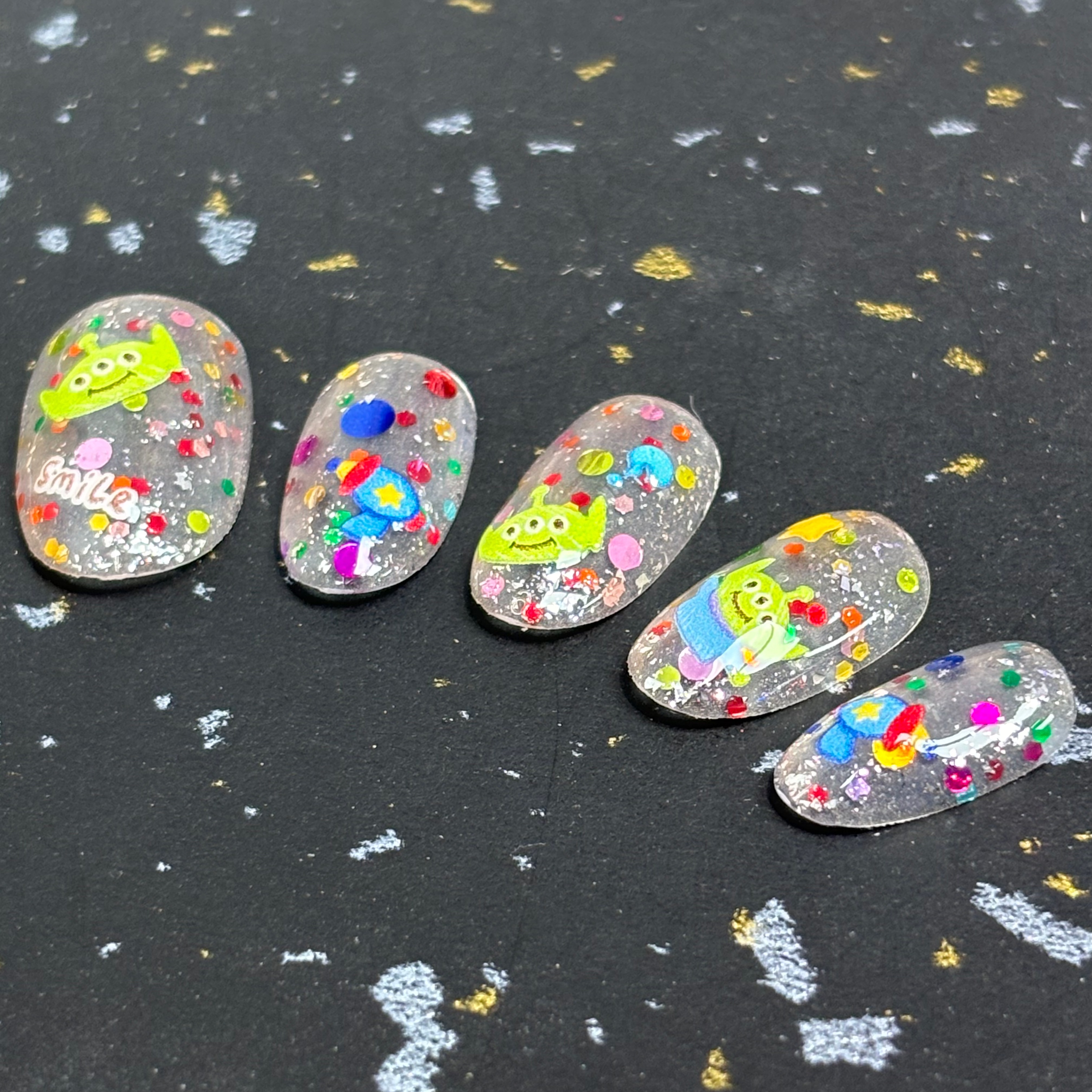 當三眼仔,跳進透明基底上形象呆萌又鮮活,彩色波點與閃片像打翻的彩虹糖罐,「Smile」「Happy」的字樣是寫給指尖的快樂密語,都像是把童年的玩具箱縮影在甲上,活潑又吸睛。把快樂具象化在指尖。 - 全人手設計穿戴甲💅 (拼貼款) ✨甲型:橢圓 ✨尺寸: M - 歡迎來圖訂製💕 (🌸圖片會有少量色差🌸)