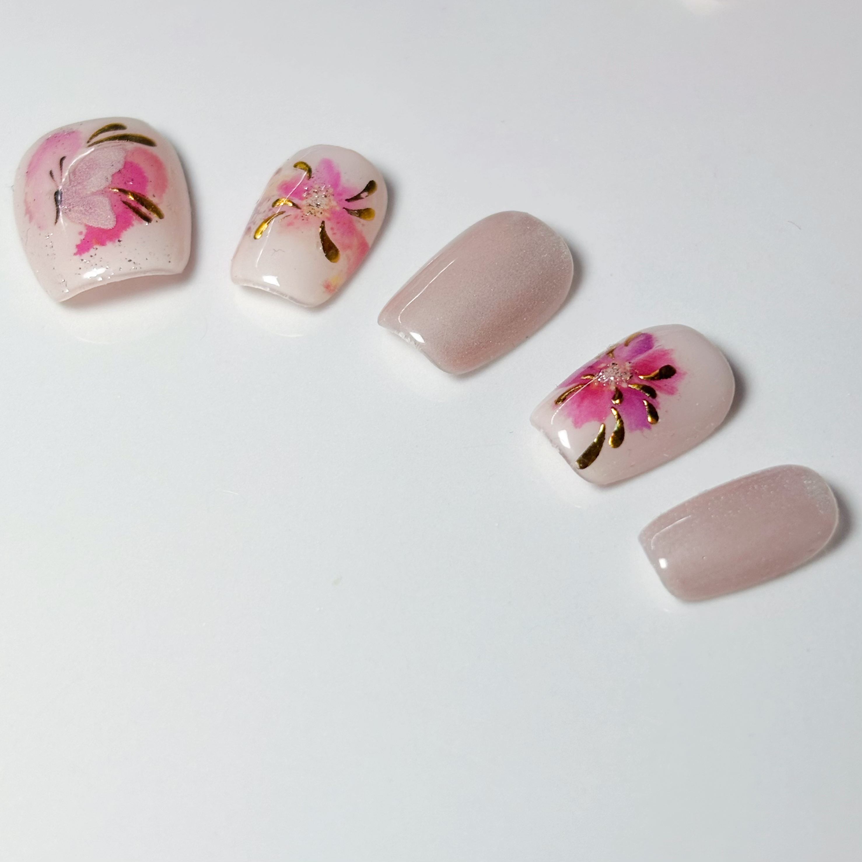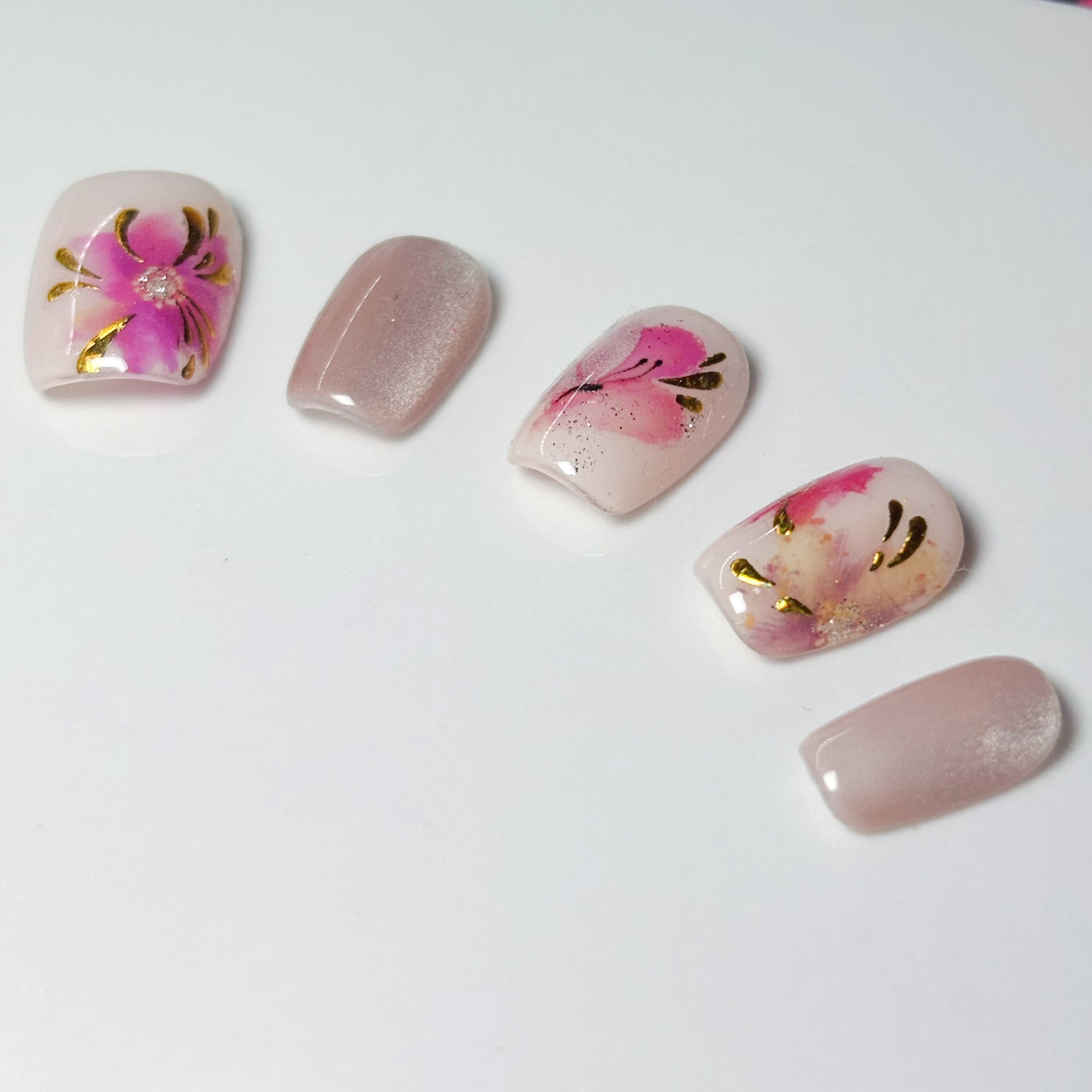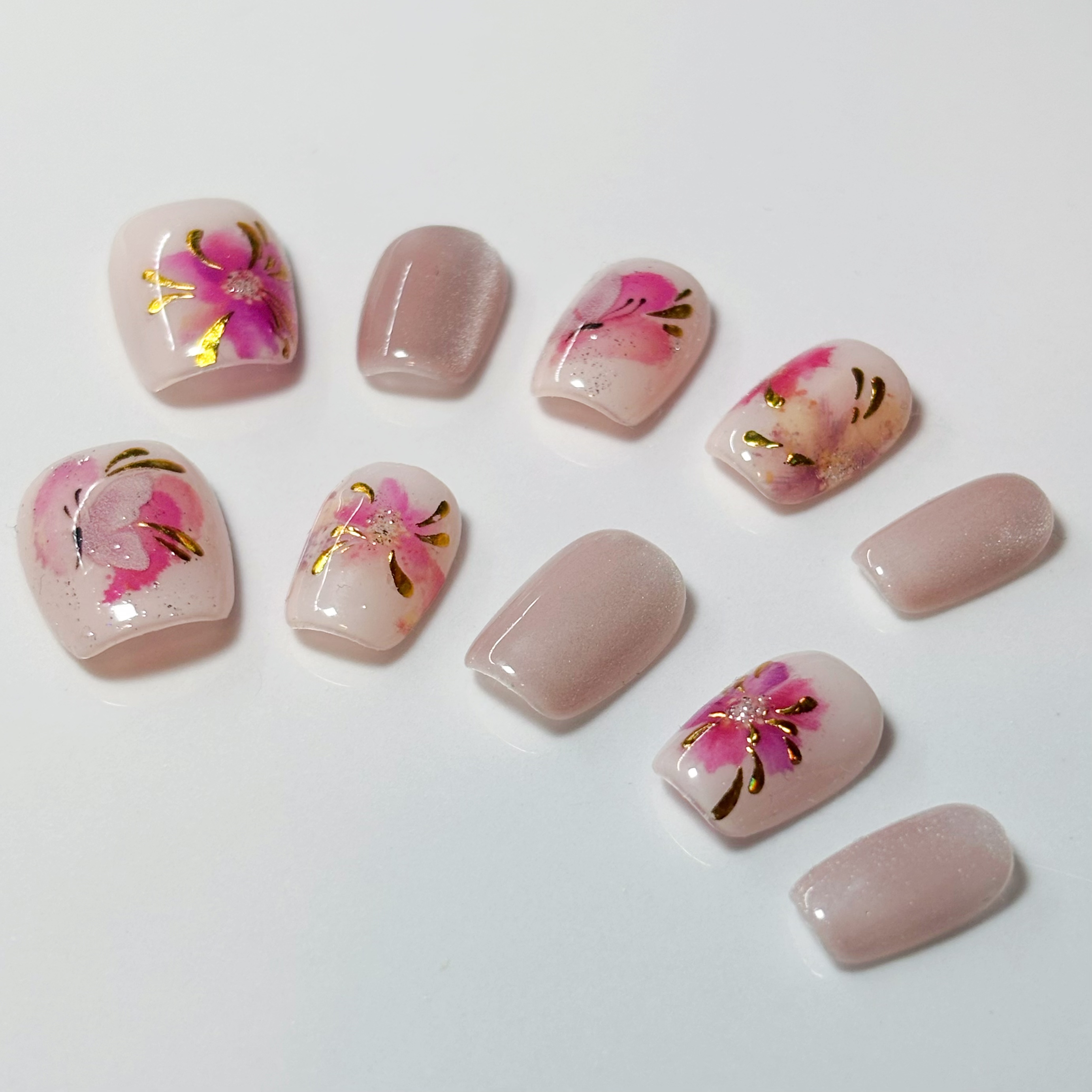 柔粉花簇在裸透甲面綻放,金線如陽光勾勒花邊,水染技法暈出的粉紫花紋,搭配霧感裸色的溫柔襯托,是浪漫花語與優雅氣場的交織。 - 全人手設計穿戴甲💅 (拼貼款) ✨甲型:方 ✨尺寸: S - 歡迎來圖訂製💕 (🌸圖片會有少量色差🌸)