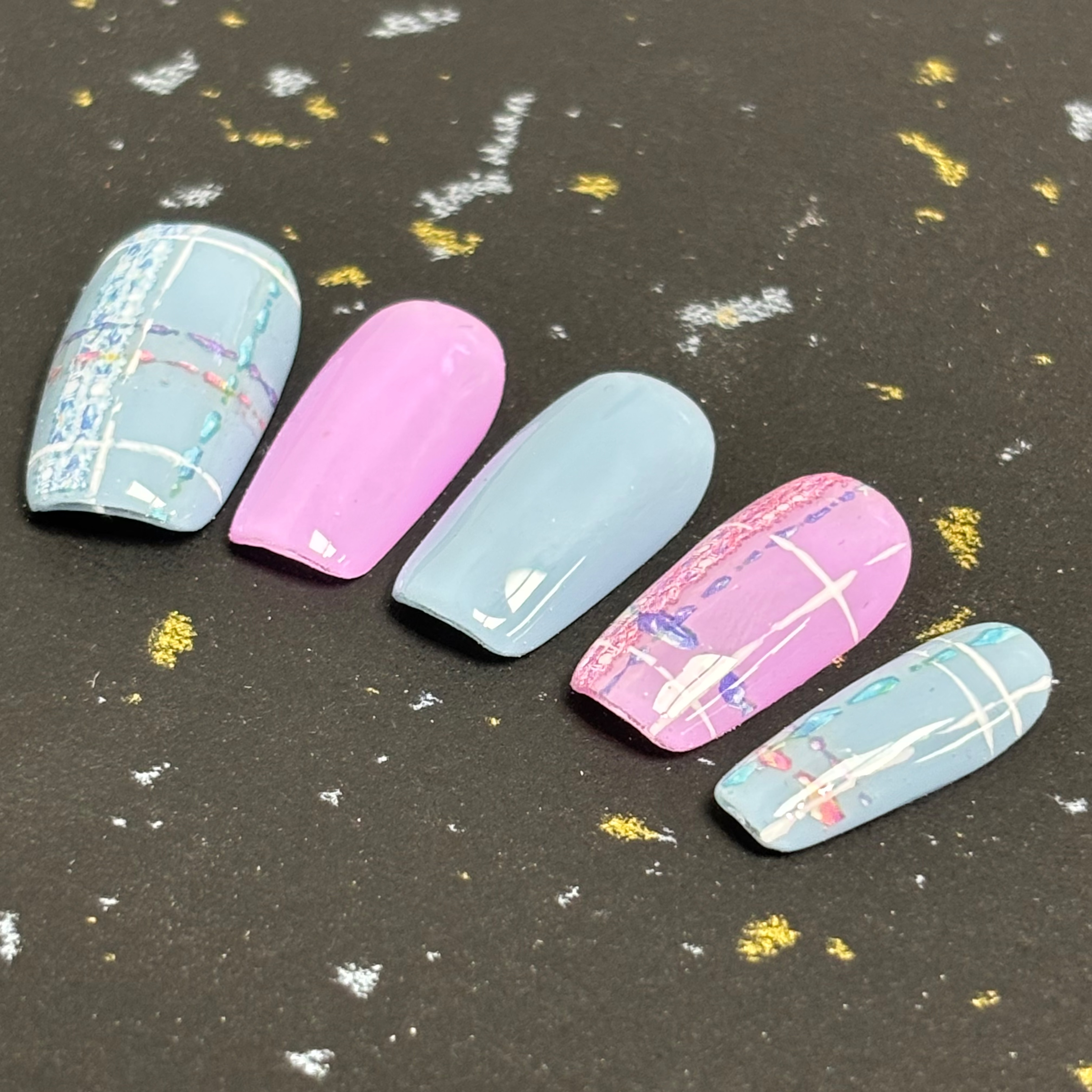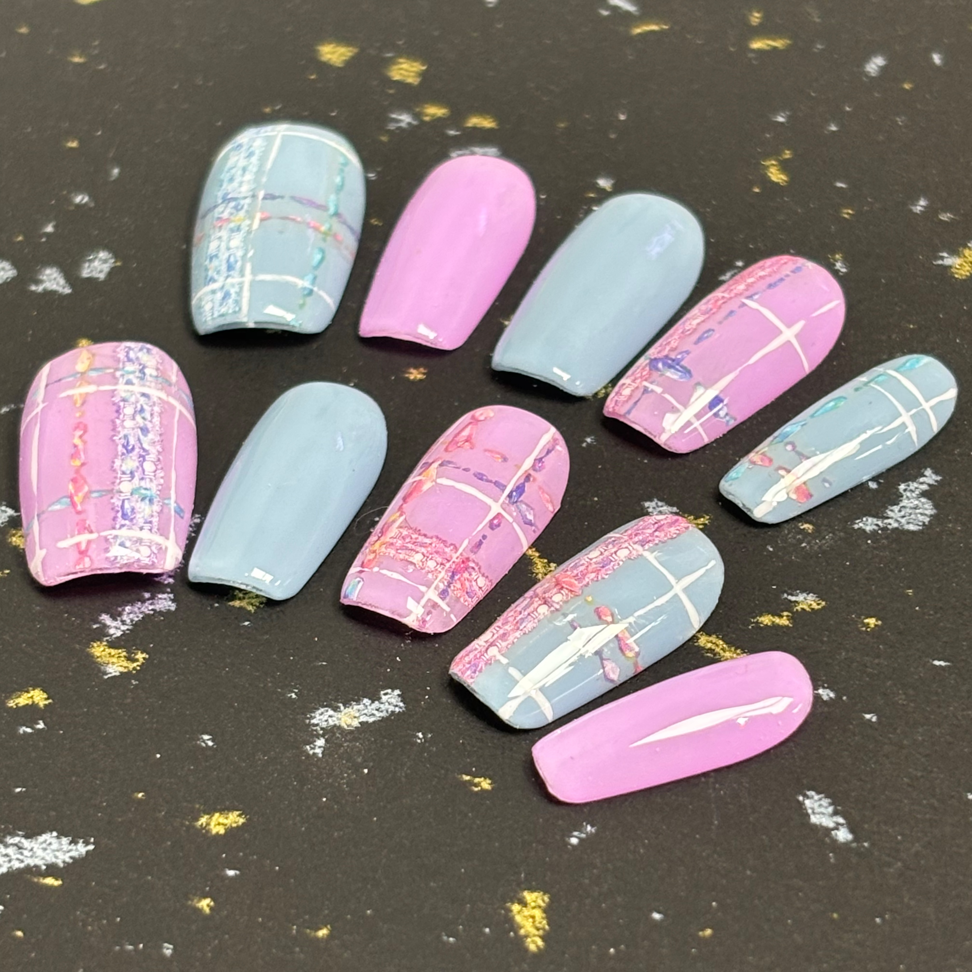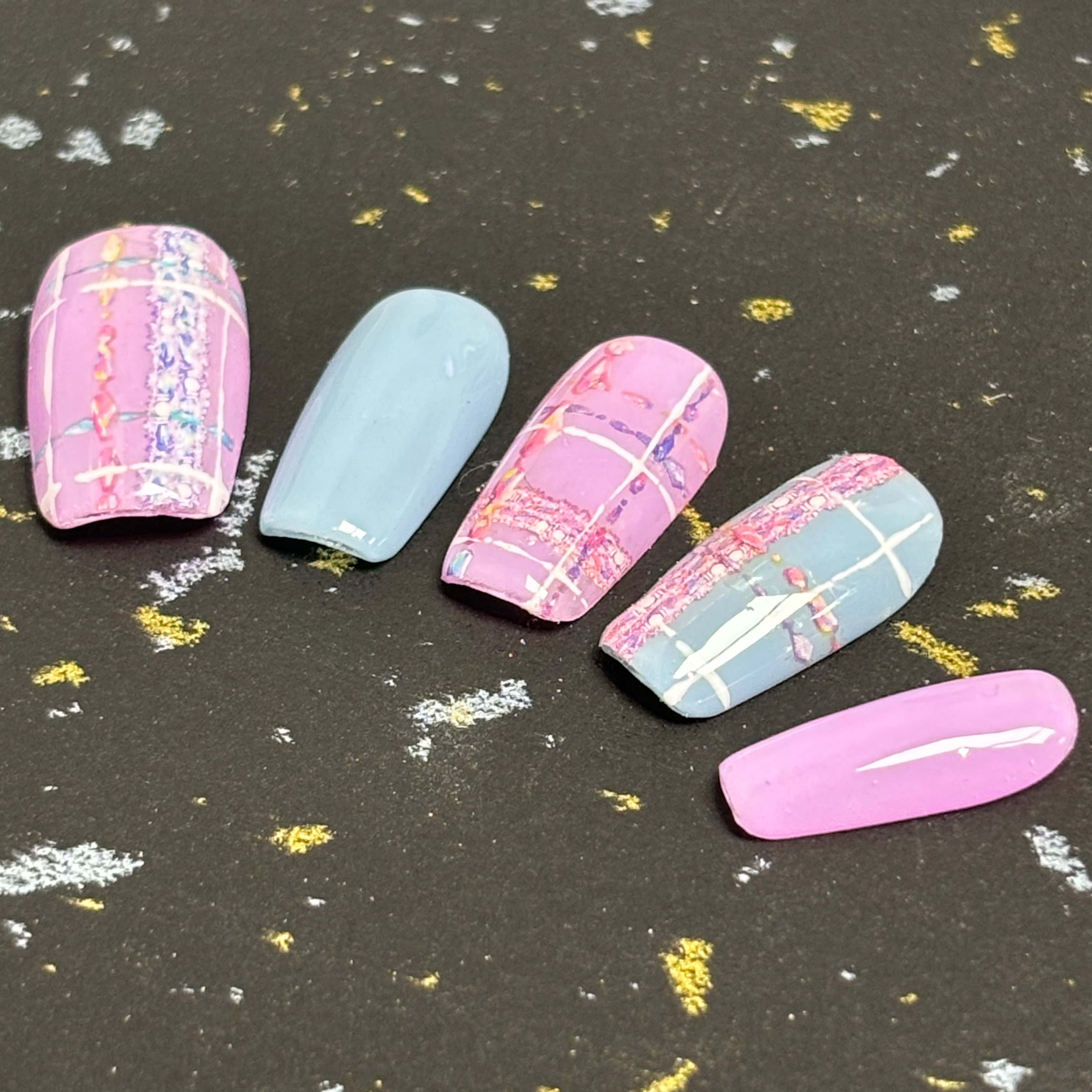 灰藍與淡紫的莫蘭迪配色,糅合出格紋的復古優雅。手繪的織物紋理帶著細膩的質感,每一處色彩都透著輕奢小眾的格調。 - 全人手設計穿戴甲💅 (手繪款+拼貼款) ✨甲型:梯方 ✨尺寸: XS - 歡迎來圖訂製💕 (🌸圖片會有少量色差🌸)