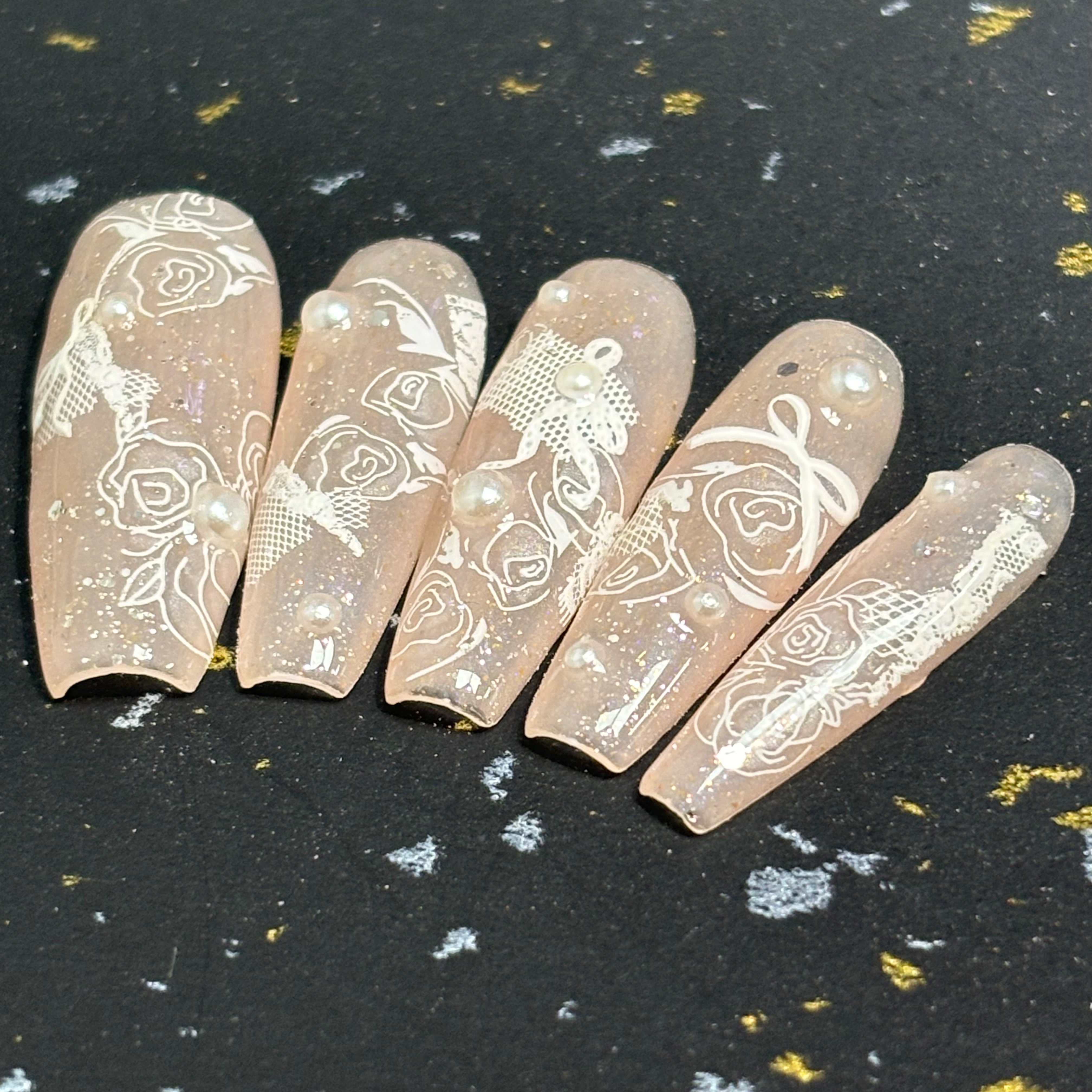 玫瑰與蕾絲的交織,復刻出中世紀宮廷的優雅;有的則是蝴蝶結與珍珠的搭配,宛若精緻的珠寶匣縮影,更添輕奢質感,讓你指尖流淌著復古優雅的氣息,成為輕奢美甲界的「優雅標桿」。 - 全人手設計穿戴甲💅 (拼貼款) ✨甲型:長梯方 ✨尺寸: S - 歡迎來圖訂製💕 (🌸圖片會有少量色差🌸)