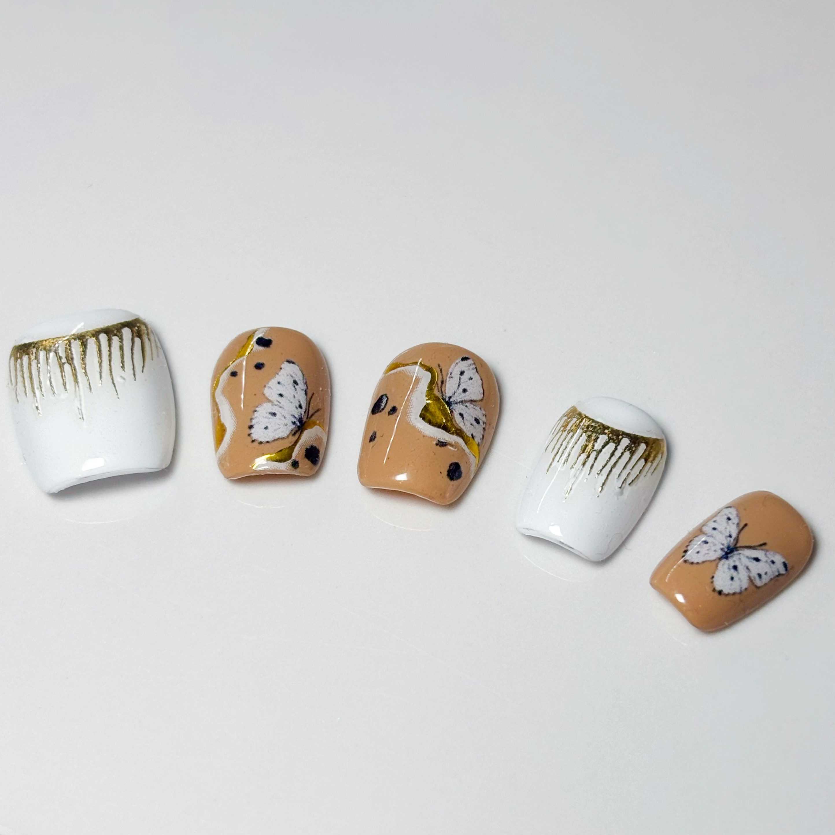 蝴蝶於裸膚色的指尖輕盈棲落,鎏金線條如藝術家的筆觸肆意流瀉,白與裸的碰撞間,將蝴蝶的靈動、金箔的奢華與水墨般的暈染融為一體,讓每一次抬手都成為別具風格的視覺驚喜。 - 全人手設計穿戴甲💅 (拼貼款) ✨甲型:方 ✨尺寸: M - 歡迎來圖訂製💕 (🌸圖片會有少量色差🌸)