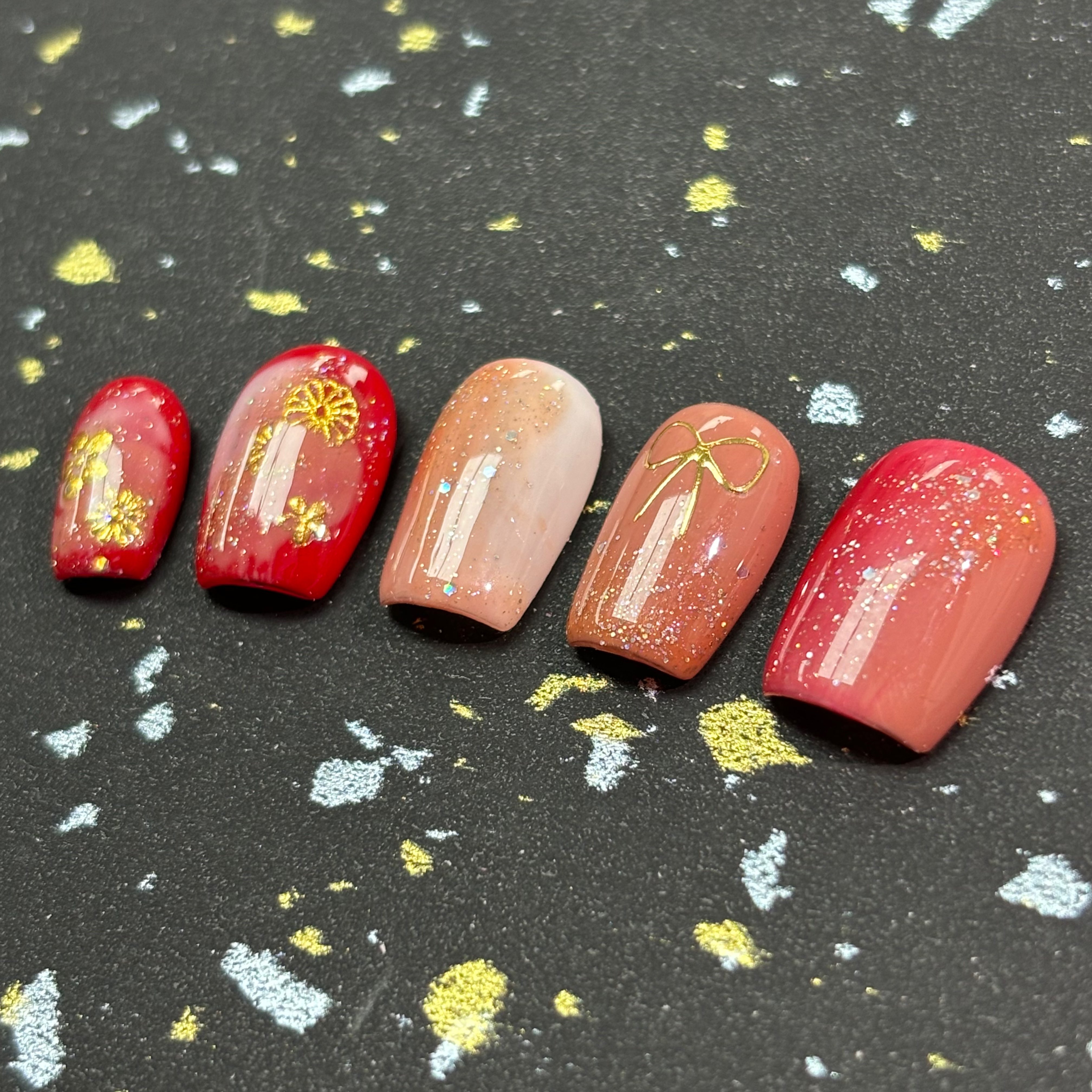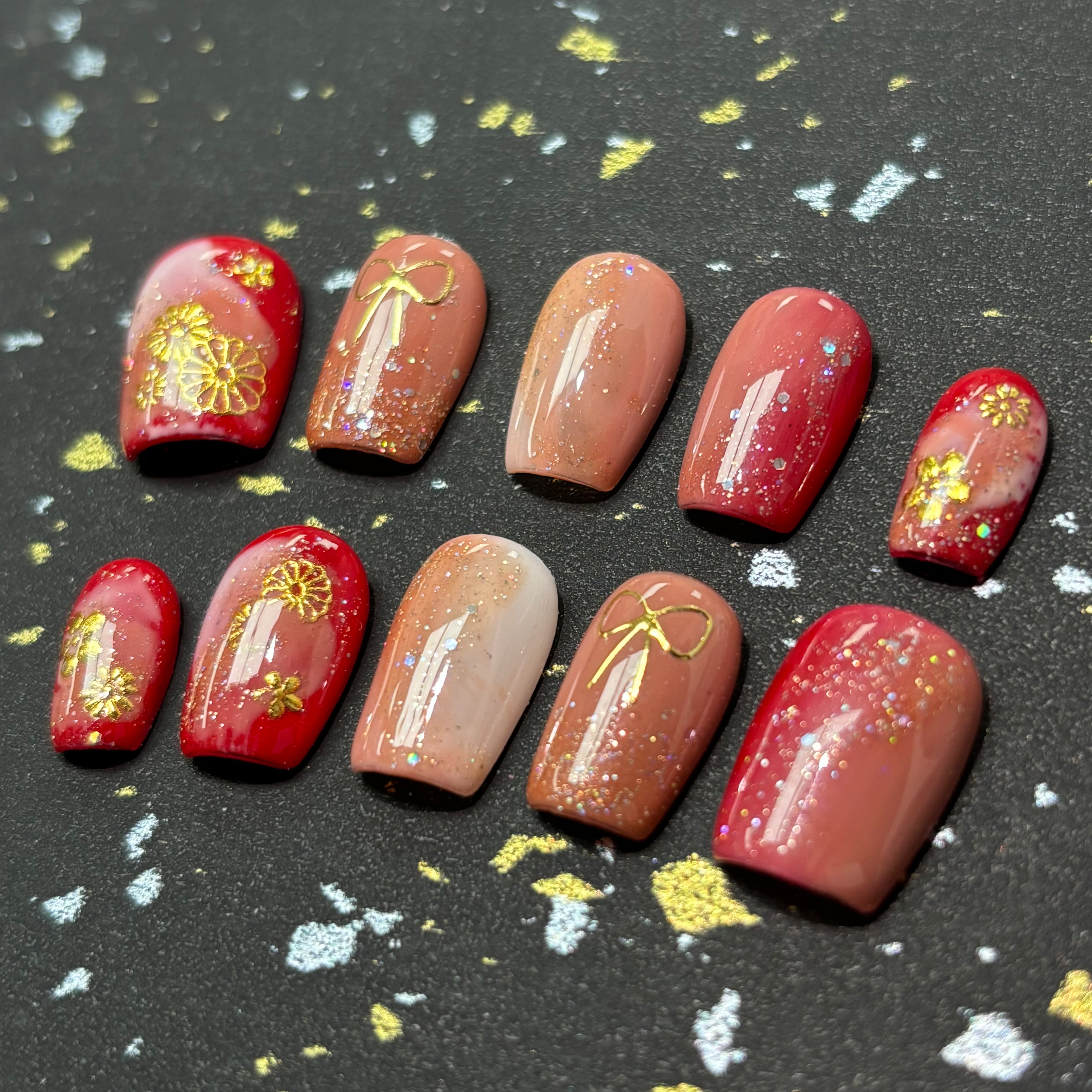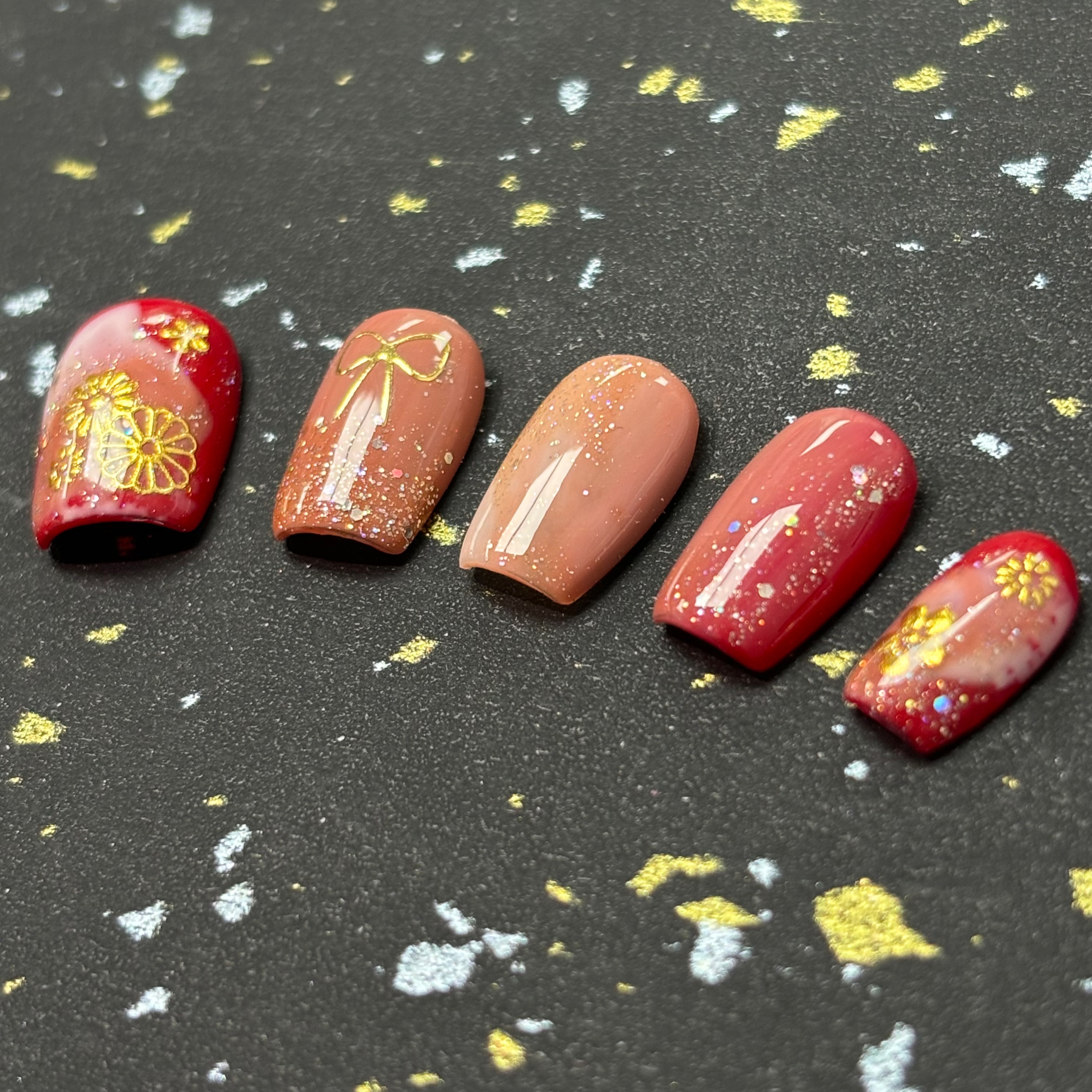 紅棕暖調暈染出秋冬的溫柔底色,金箔花卉重彩般精緻,蝴蝶結線條又添幾分甜系俏皮,暖棕閃粉似細碎星光灑落甲面。是溫婉甜美的秋冬氛圍感,是佳節赴宴、日常出街都能hold住的吸睛選擇。 - 全人手設計穿戴甲💅 (拼貼款+手繪款) ✨甲型:方 ✨尺寸: S - 歡迎來圖訂製💕 (🌸圖片會有少量色差🌸)
