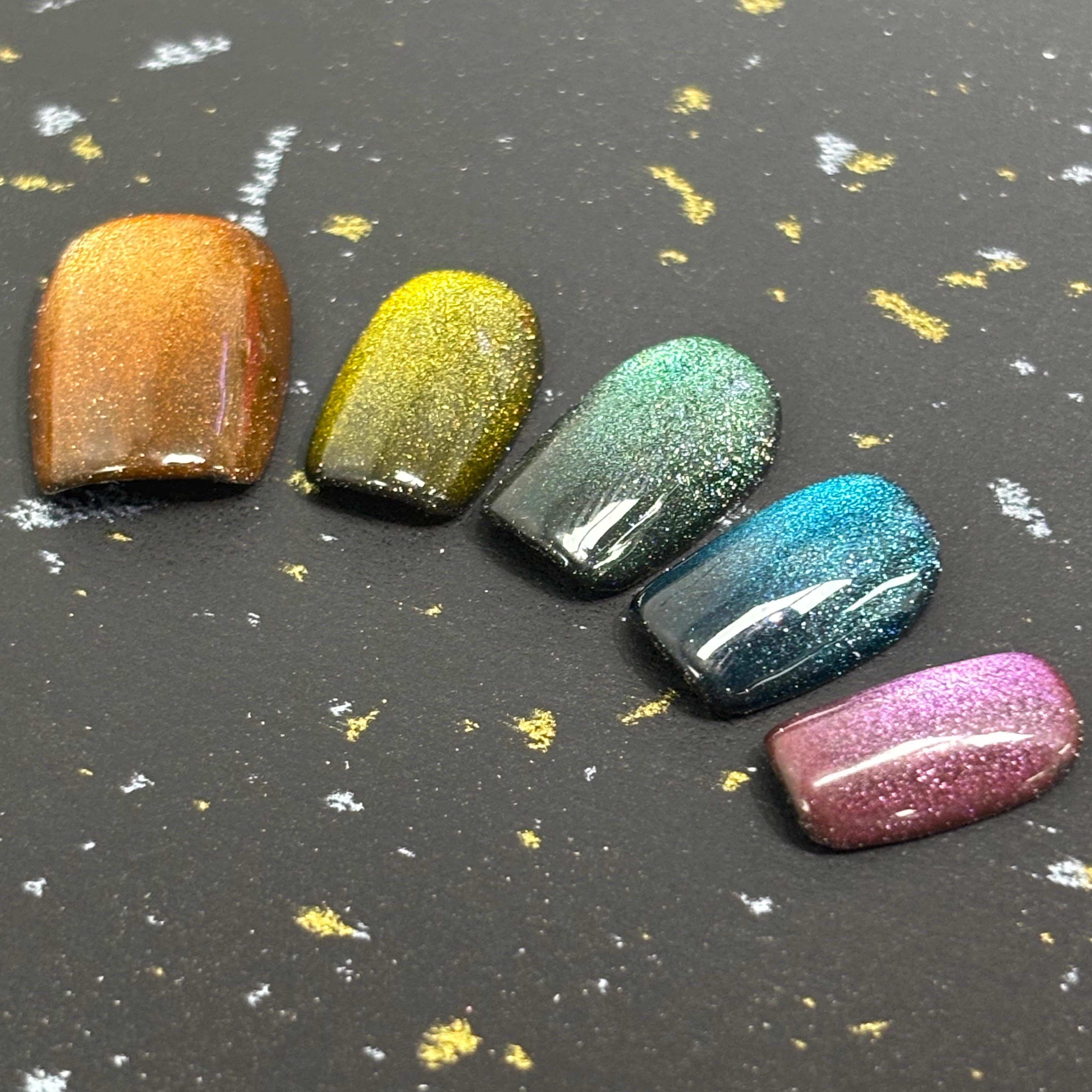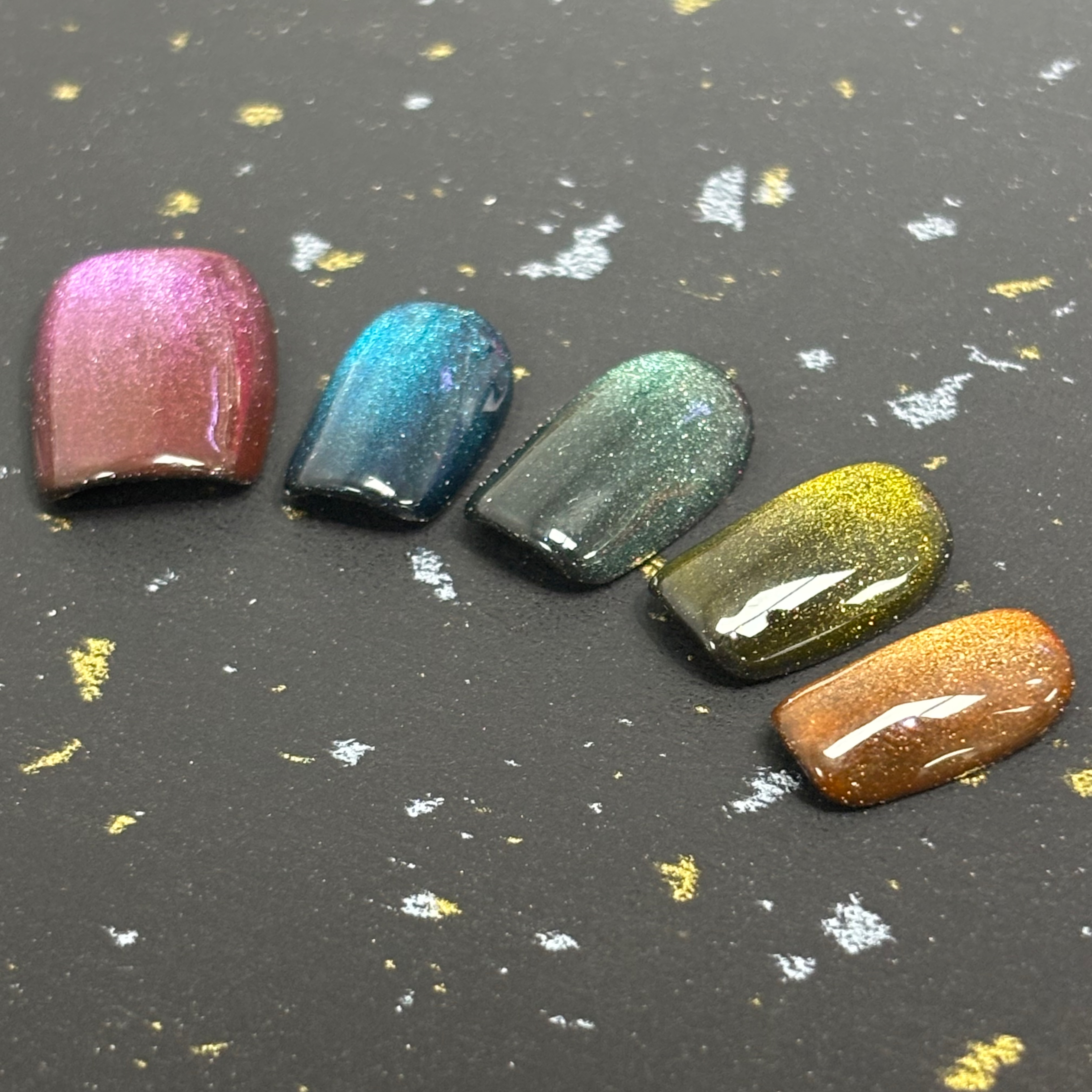 當多元鐳射色撞上貓眼特效,紫霞色如星雲暈染,孔雀藍似深海極光,墨綠款藏著森林螢火,金棕調泛著復古金屬光,每一款都帶著細膩的鐳射閃粉,在光下折射出流動的貓眼光澤,像把整片銀河的璀璨都凝在了指甲上。 - 全人手設計穿戴甲💅 (手繪款) ✨甲型:方 ✨尺寸: M - 歡迎來圖訂製💕 (🌸圖片會有少量色差🌸)