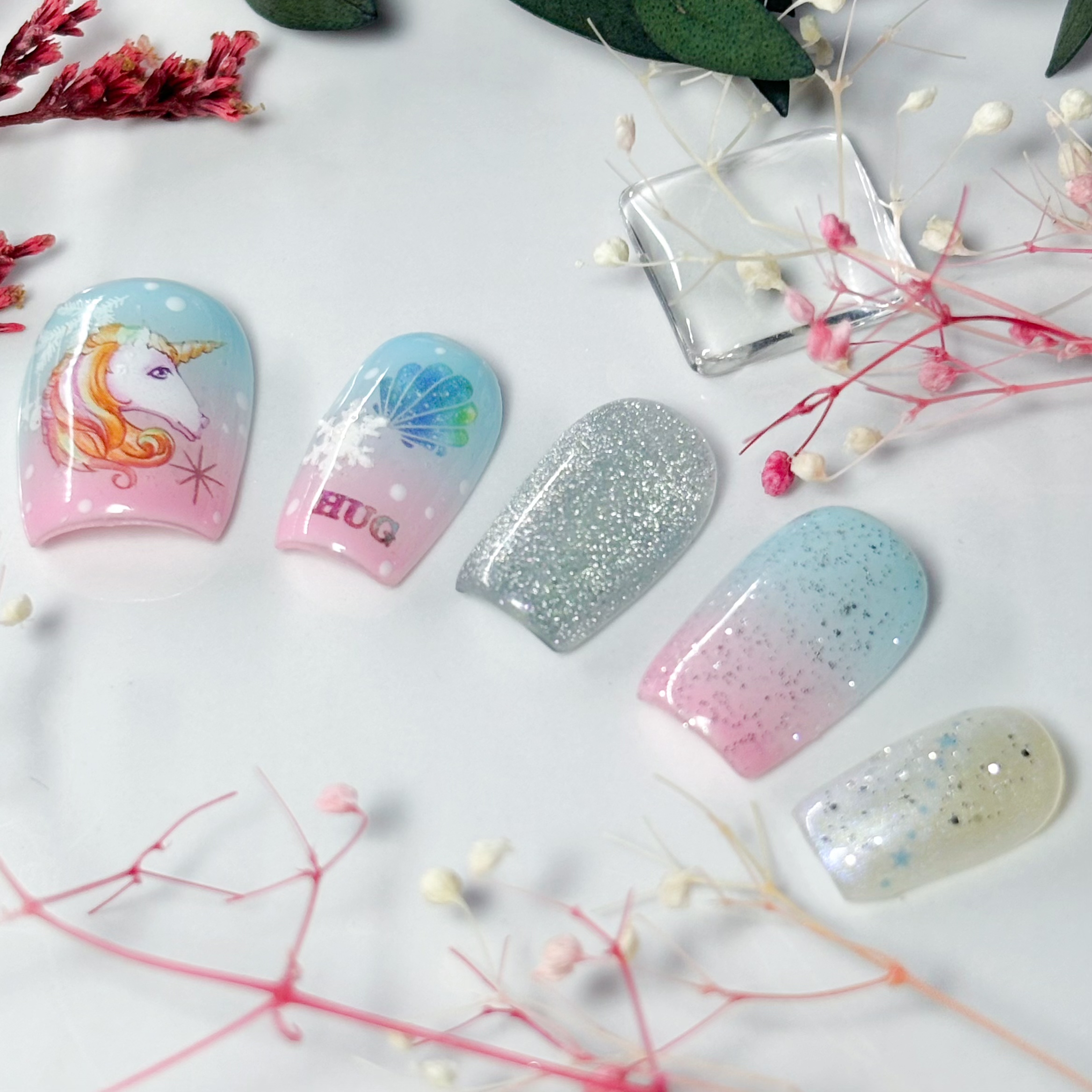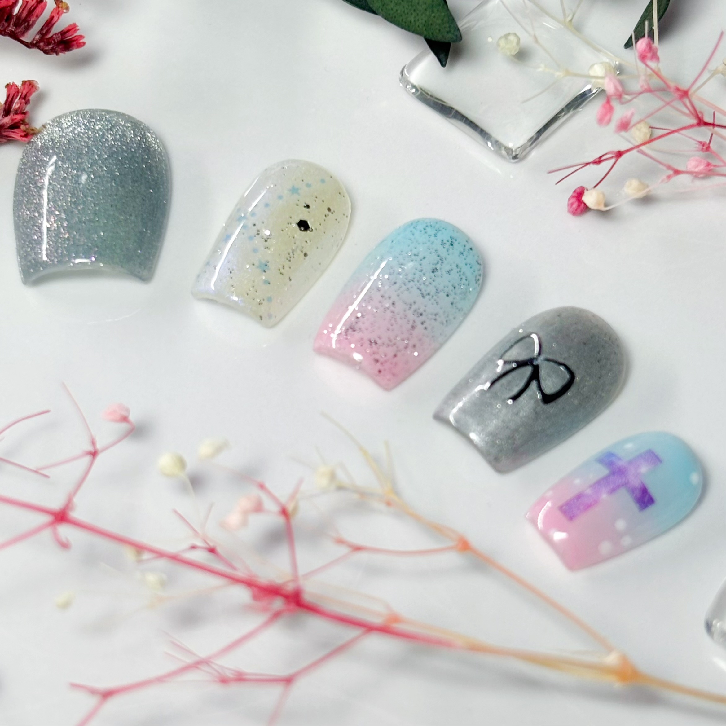 粉藍漸變像揉碎的雲朵,獨角獸彩繪帶著夢幻童話感,銀閃和星星點綴像裹了層星霧,甜酷的蝴蝶結、十字架裝飾又添了點個性,是把少女心和小叛逆都裝在指尖的感覺。 - 全人手設計穿戴甲💅 (拼貼款+手繪款) ✨甲型:方 ✨尺寸: S - 歡迎來圖訂製💕 (🌸圖片會有少量色差🌸)