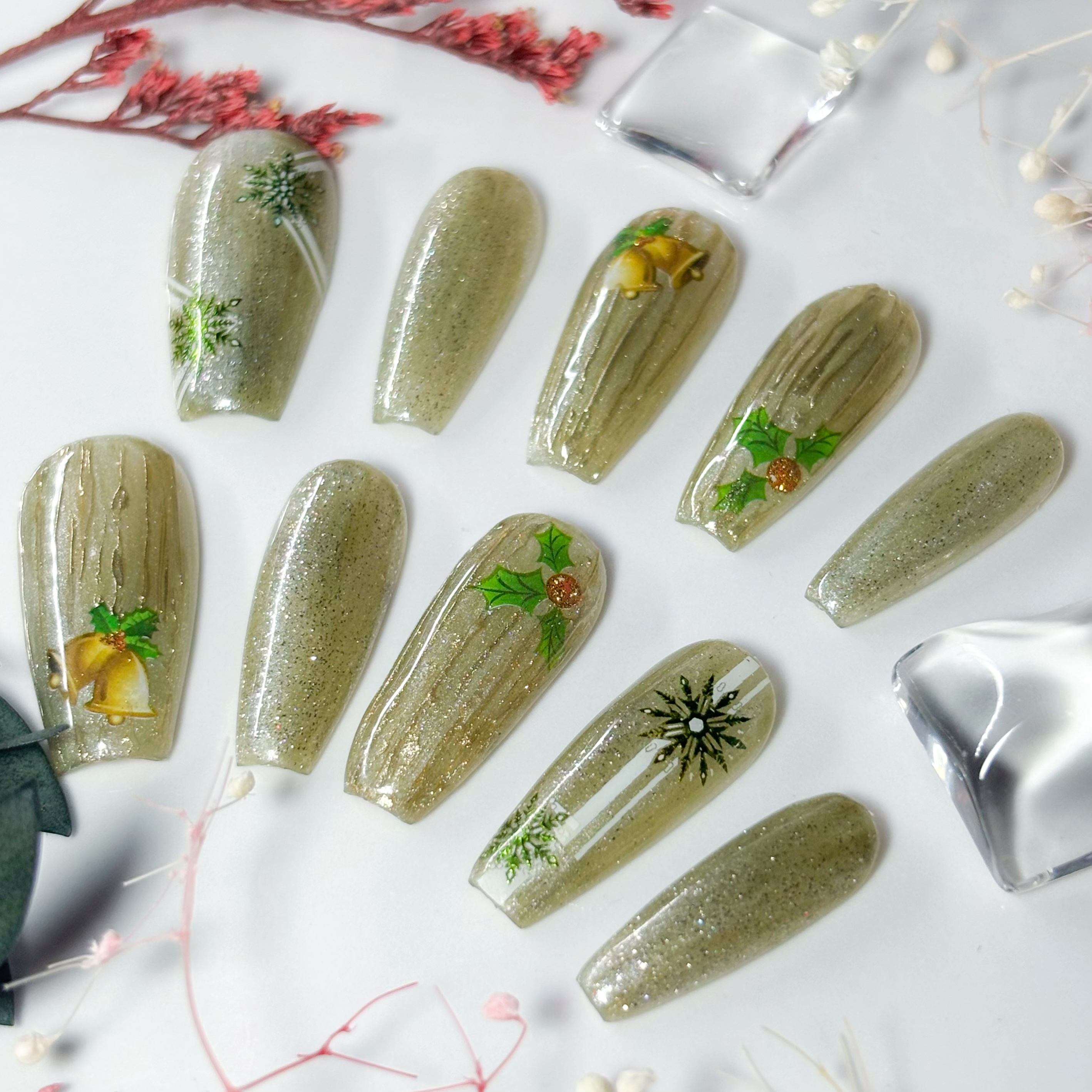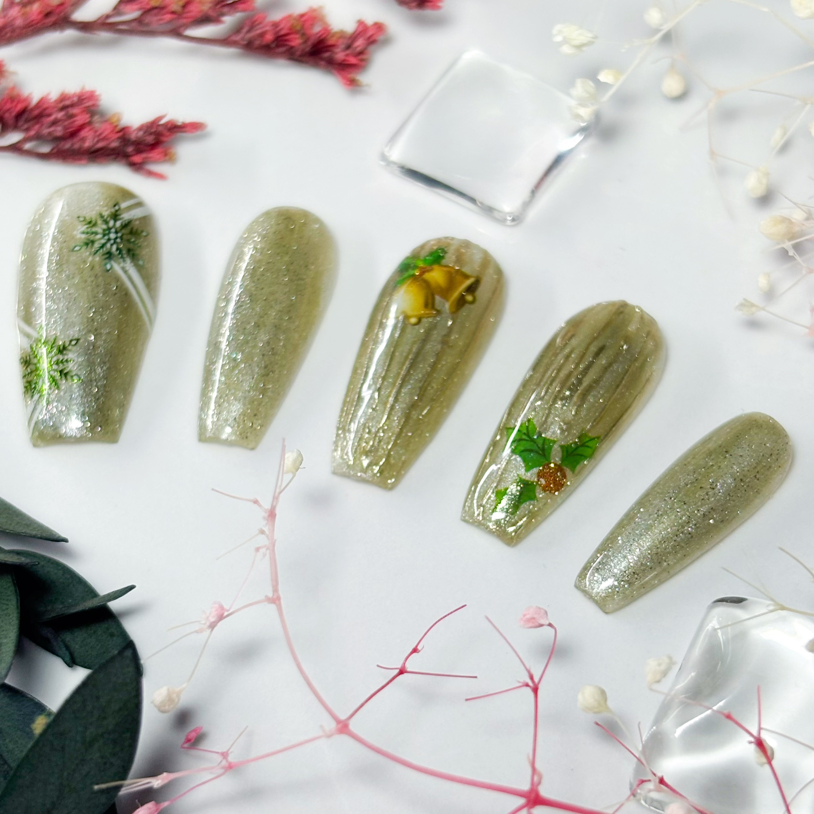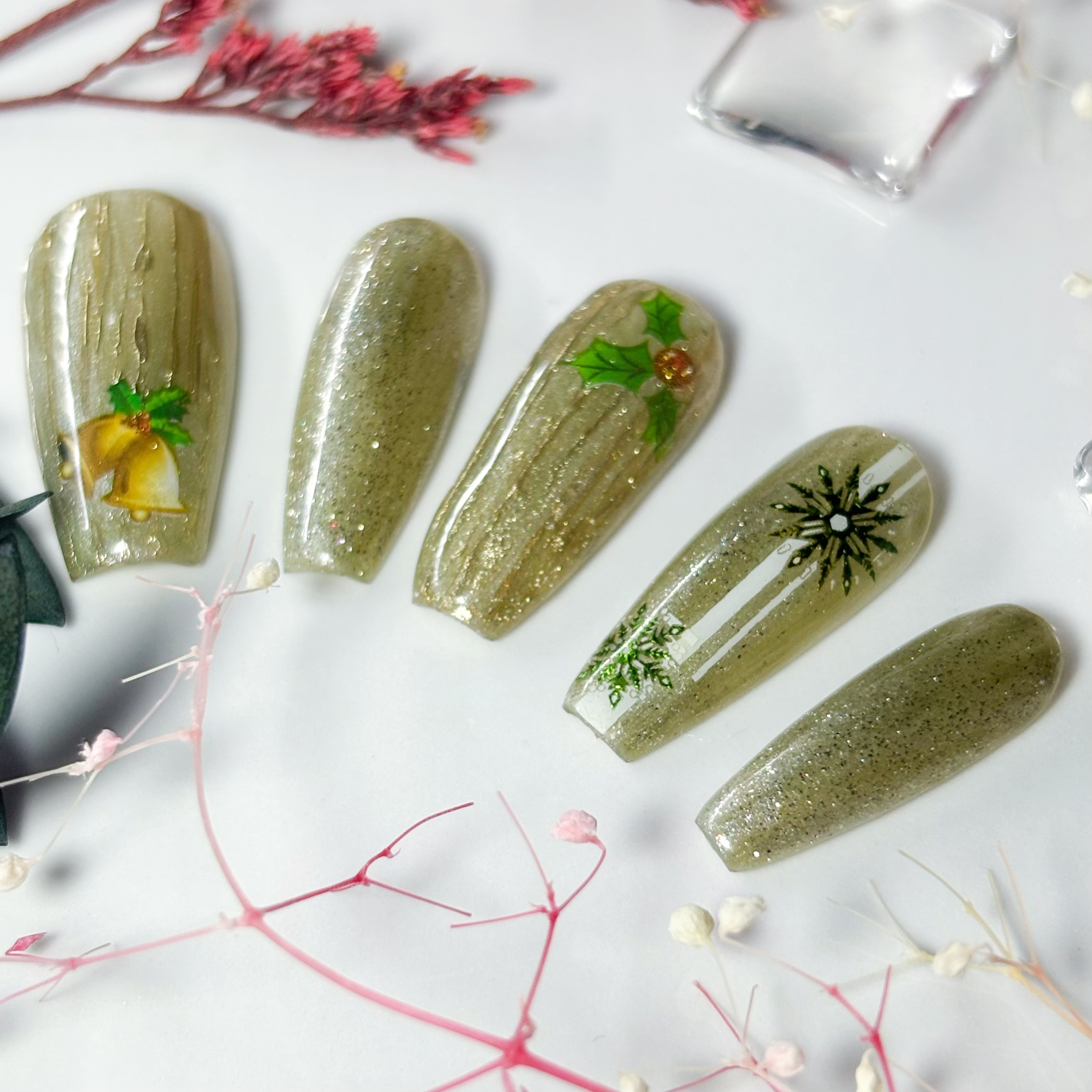 淺橄欖綠像冬日松枝的柔和底色,金閃細碎得像落了層栗殼碎,聖誕鈴鐺、冬青葉的點綴剛好戳中暖冬節日感,清透又自帶溫柔氛圍。 - 全人手設計穿戴甲💅 (拼貼款+手繪款) ✨甲型:長梯方 ✨尺寸: S - 歡迎來圖訂製💕 (🌸圖片會有少量色差🌸)