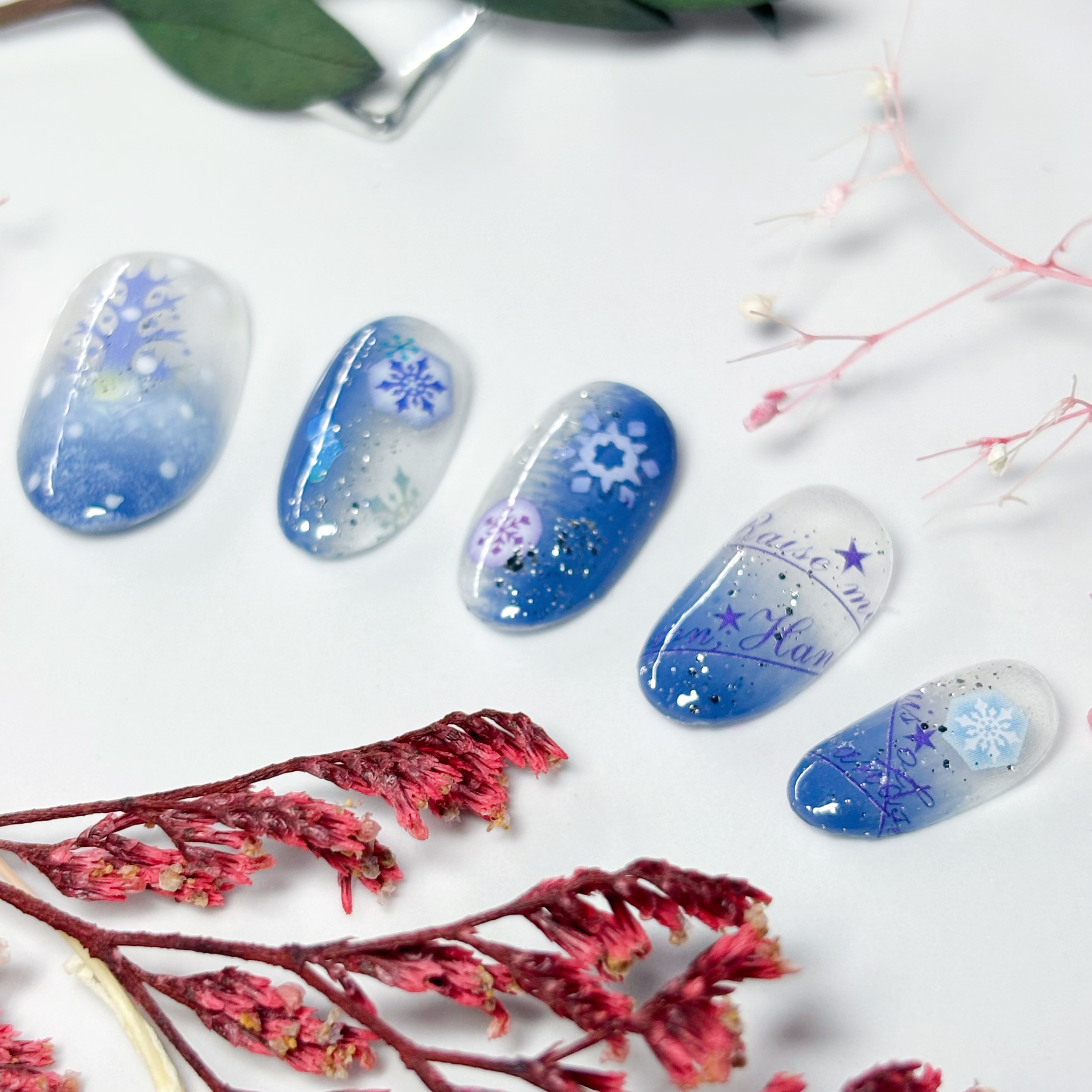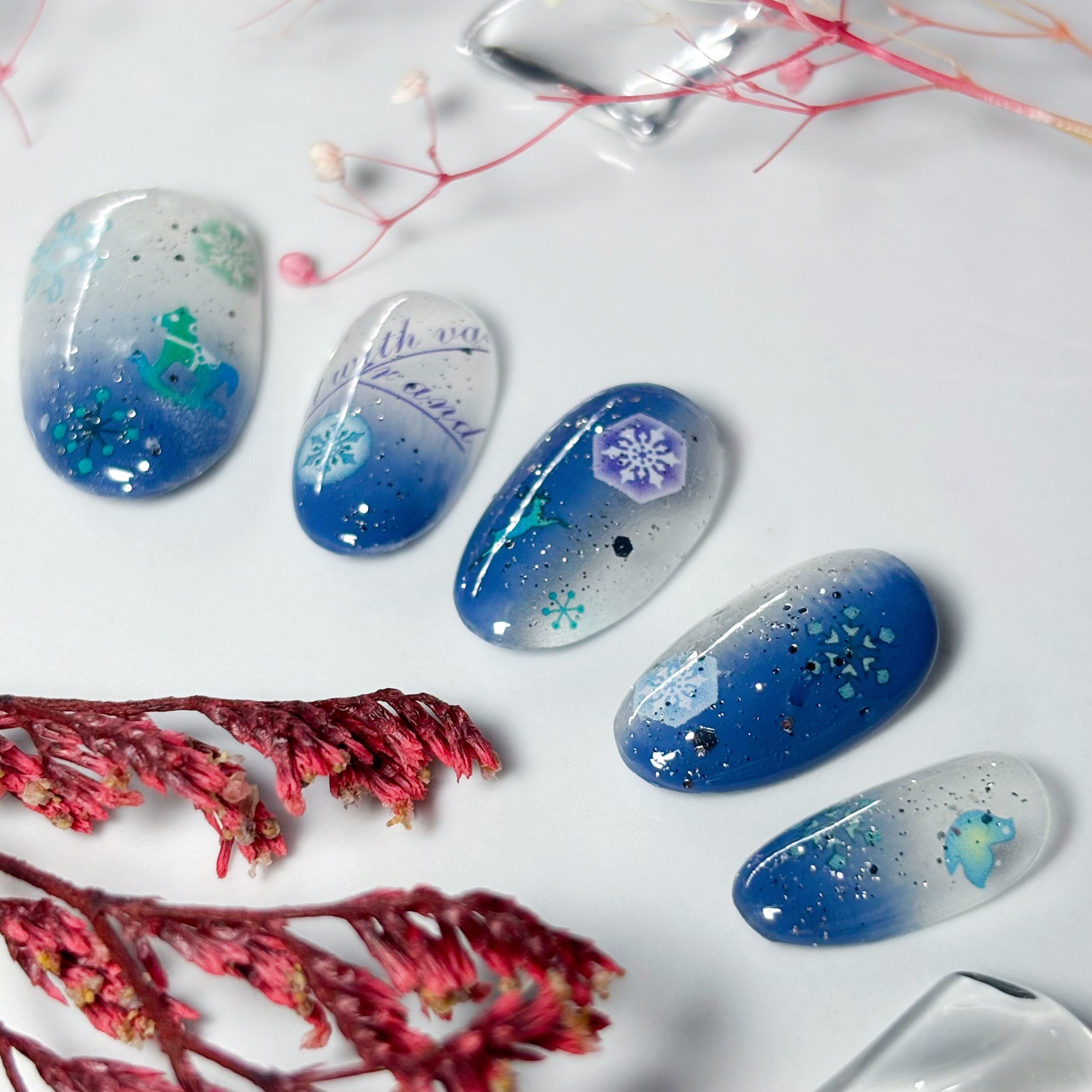 漸變藍像揉碎的深海星光,雪花、小木馬的點綴是冬夜的溫柔小細節,細碎閃片像落雪般清透,連文字裝飾都帶著冬日的靜謐氛圍感。 - 全人手設計穿戴甲💅 (拼貼款+手繪款) ✨甲型:橢圓 ✨尺寸: S - 歡迎來圖訂製💕 (🌸圖片會有少量色差🌸)
