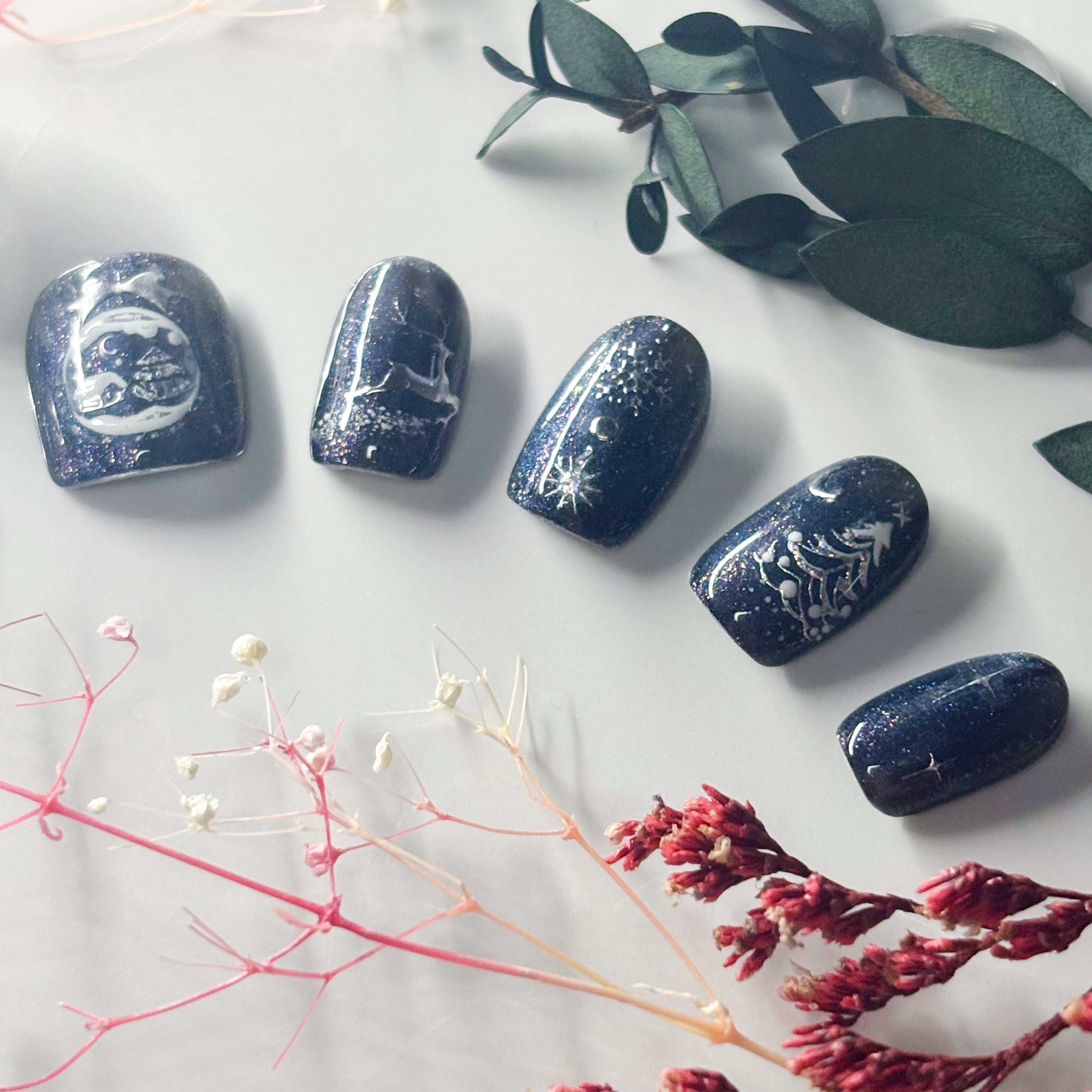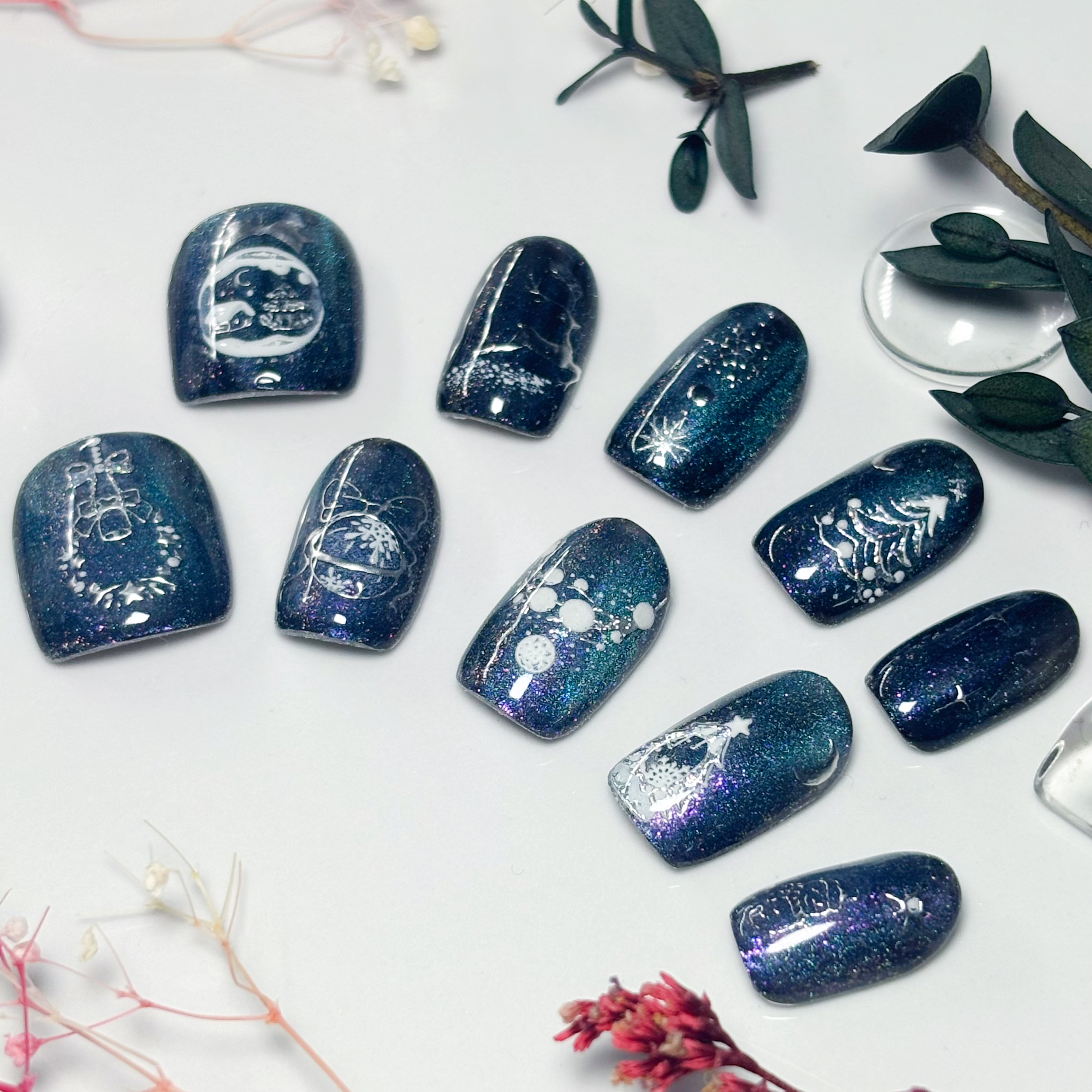 深海藍貓眼裹著細閃像揉碎了夜空,白描的聖誕樹、雪花、鈴鐺藏在星芒里,抬手就能晃出冷調極光,浪漫的節日感。 - 全人手設計穿戴甲💅 (拼貼款) ✨甲型:方 ✨尺寸: M - 歡迎來圖訂製💕 (🌸圖片會有少量色差🌸)