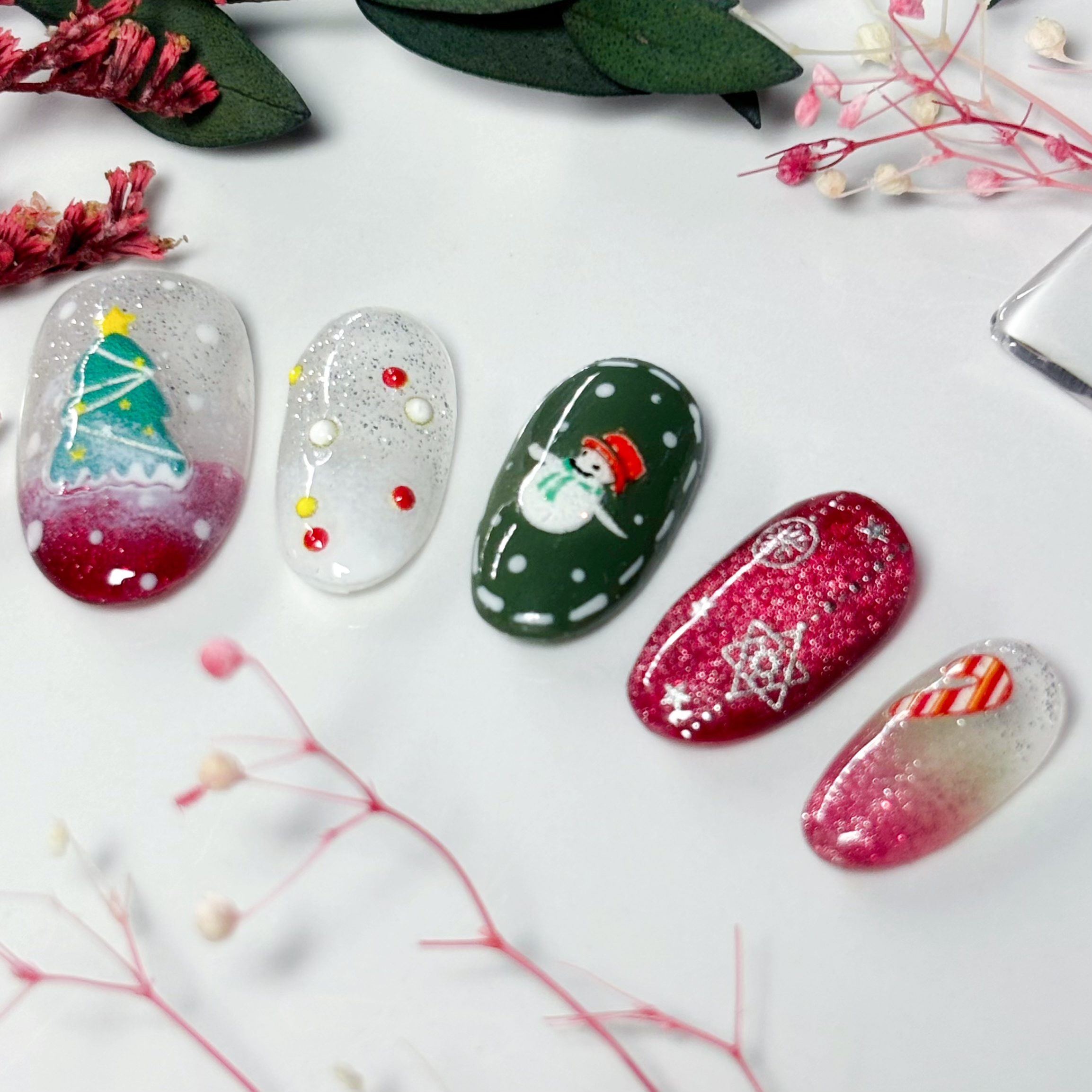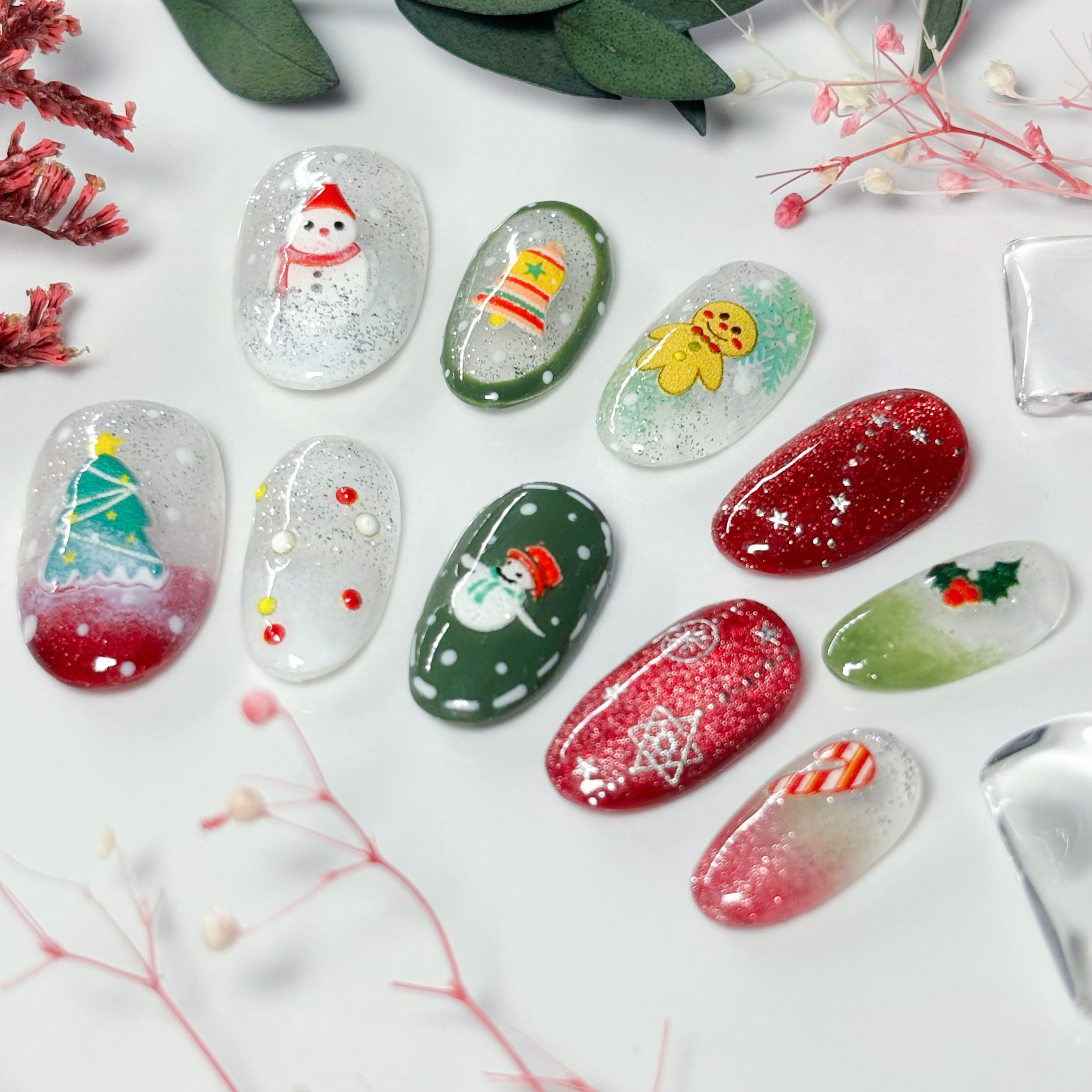 紅白綠的配色像剛出爐的聖誕曲奇,雪人、姜餅人、聖誕樹的彩繪軟萌又治癒,清透底+碎閃像裹了層糖霜,是把聖誕甜品店揣在指尖的溫暖感。 - 全人手設計穿戴甲💅 (拼貼款+手繪款) ✨甲型:橢圓 ✨尺寸: S - 歡迎來圖訂製💕 (🌸圖片會有少量色差🌸)