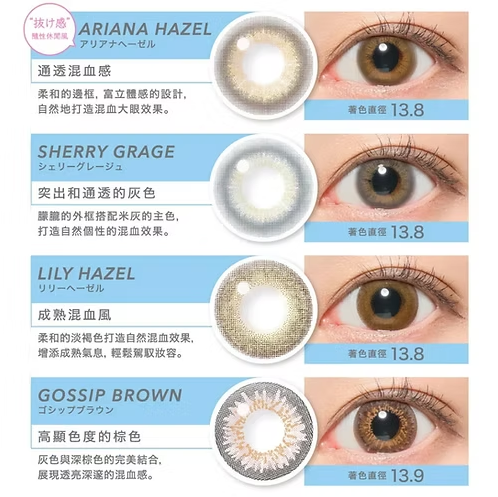 品牌:Candy Magic 製造商 : LCode 更換需知 : 每日即棄 功能 : 彩妝 鏡片直徑 : 14.5 mm 含水量 :69% 包裝 : 10片 / 盒 鏡片可提供弧度:8.7 mm 度數可提供範圍 : 近視0度 至近視600度(每25度一級) 近視650度 至近視900度 (每50度一級) Ariana Hazel Beginner Black Beginner Chocolate Date Brown Glass Brown Gossip Brown King Brown Lily Hazel Mini Brown Marriage Moca Natural Brown Pure Etoile Sugar Brown Sherry Grage (如想下單,請與客服聯絡) 由日本銷量Number 1——高質感美瞳品牌Candy Magic品牌推出的ReVIA抗藍光彩色隱形眼鏡,鏡片由淺黃色升級至淺綠色,抗藍光能力提高至18%,有助減低藍光對眼睛的傷害及負擔,可說是亞洲視光學科技的突破!疫情期間,減輕看電腦螢幕的傷害!自然的顏色設計適合日常配戴,即使素顏妝扮,眼睛都能清澈透亮、炯炯有神! 🌟落單後約5個工作天寄出